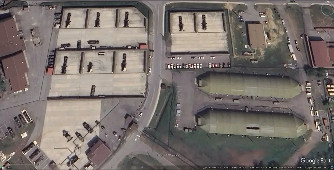Спутниковый снимок Google Earth: элементы ЗРК Patriot на военной базе в 15 км северней города Тэгу. Снимок сделан в декабре 2023 года