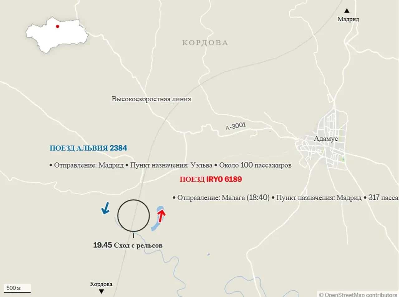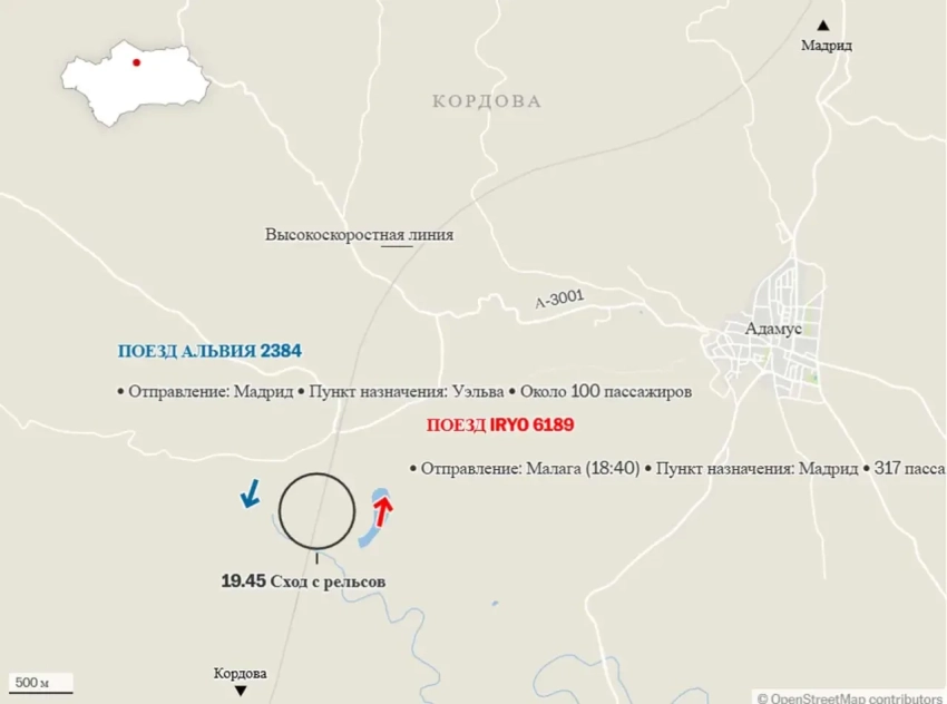 Речь идёт о схождении с рельсов пассажирского поезда Iriyo Малага-Мадрид, в котором было более 300 пассажиров. Вагоны поезда, по последним данным, при схождении врезались в другой поезд (Alvia), который двигался на скорости около 200 км/ч в противоположном направлении (Мадрид-Уэльва) по соседнему пути, и в результате столкновения составы сорвались с 4-метровой насыпи, доступ к которой затруднён. В скоростном поезде Alvia было около сотни пассажиров.