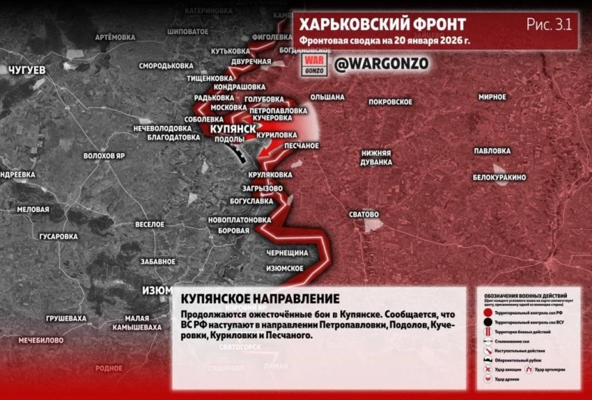Карта боевых действий на Купянском направлении по состоянию на 20.01.2026