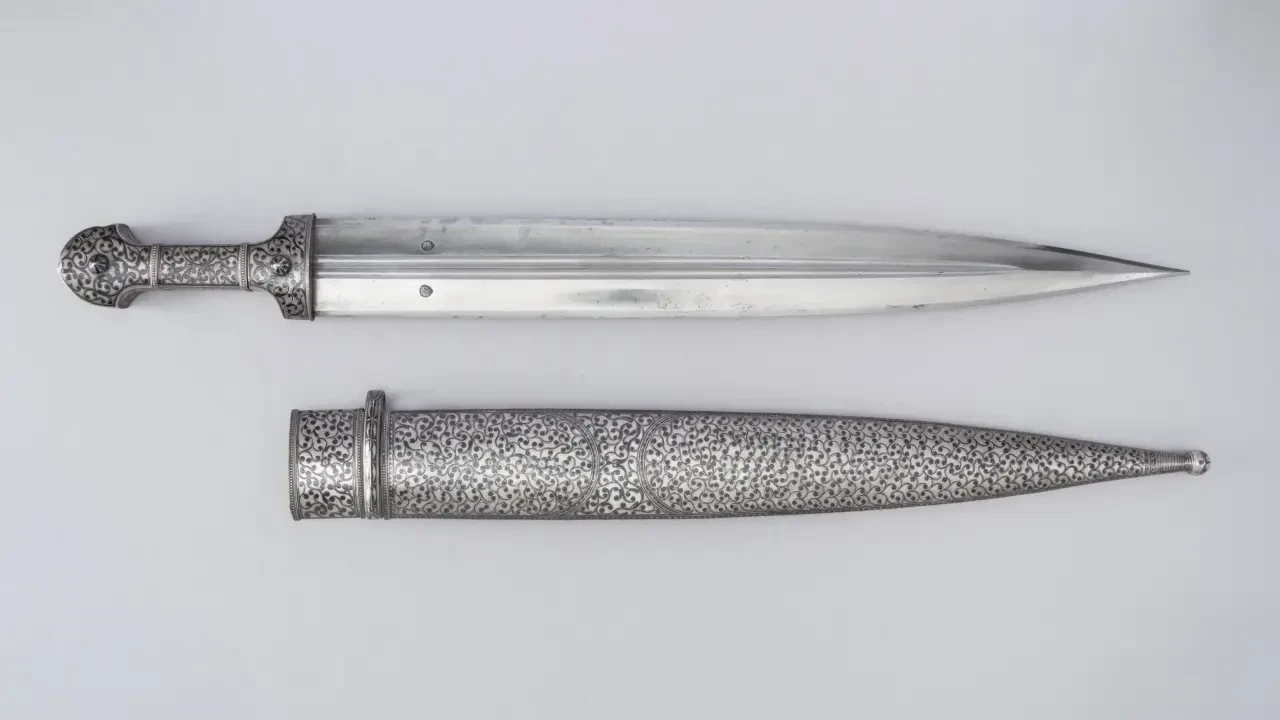 Кавказский кинжал – традиционное оружие горцев и принадлежность их национального костюма, изготовленный в селении Кубачи в Дагестане. Ок. 1818–1819 гг. Материалы: сталь, серебро, чернь, дерево. Длина: 55,88 см