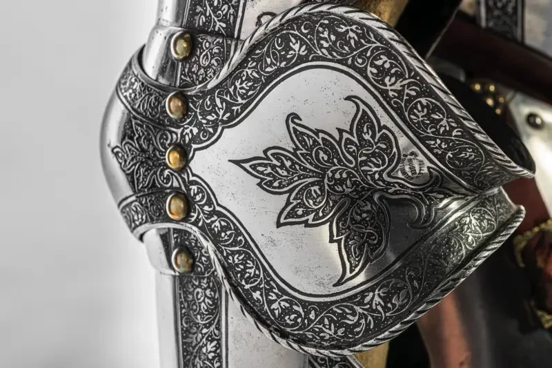 «Раковина» наколенника. Обычно такие узоры в XVI веке изготовляли методом травления. Металл покрывался воском, затем узоры процарапывались иглой, а потом деталь погружалась в кислоту. После этого изделие промывали, удаляли с него воск, если это было необходимо, дорабатывали узор штихелями и заполняли углубления чернью, которая при последующем нагревании спекалась с металлом. Инкрустация подобных узоров сделала бы цену этого доспеха поистине заоблачной, не говоря уже о том, что канавки под узор на металле могли бы серьезно его ослабить! Королевский музей армии и военной истории Бельгии, Брюссель