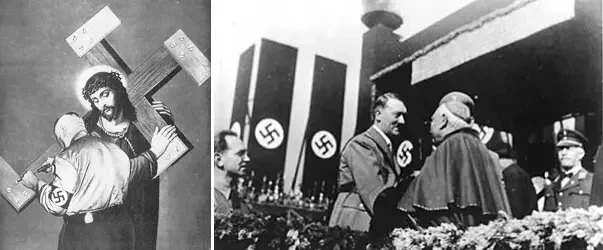 На фото слева: церковная кафедра Церкви Рейха. На фото справа: католические священнослужители выполняют нацистское приветствие рядом с лидерами НСДАП, включая Йозефа Геббельса (крайний справа). Источник: Bildagentur