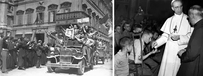На фото слева: католические партизаны держатели плакатов с изображением Папы Пия XII во время освобождения Рима 4 июня 1944 года. На фото справа: Папа Пий XII встречается с детьми, пострадавшими во время войны
