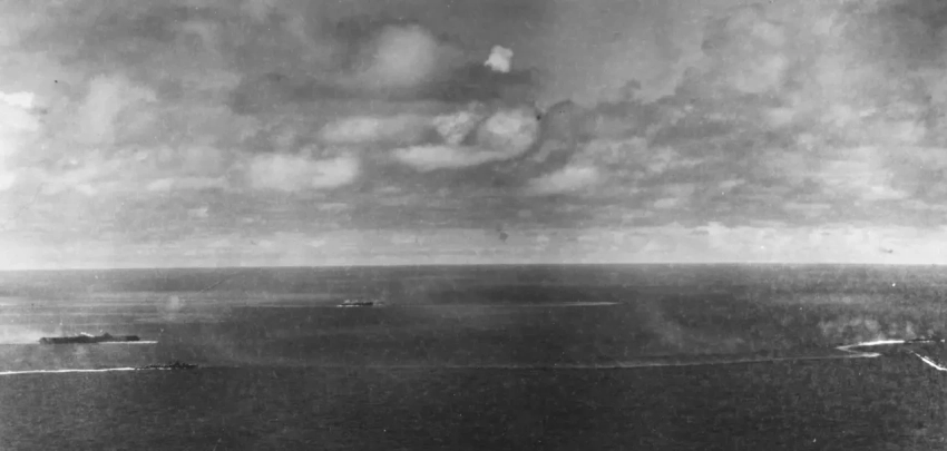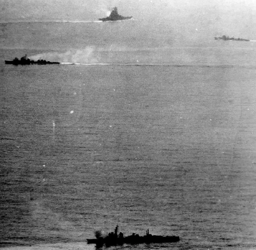 Фотография грибовидного облака, образовавшегося в результате взрыва «Ямато». Эсминцы «Юкикадзэ», «Хацусимо» и «Фуюцуки» пытаются подойти к «Ямато» для спасения экипажа.