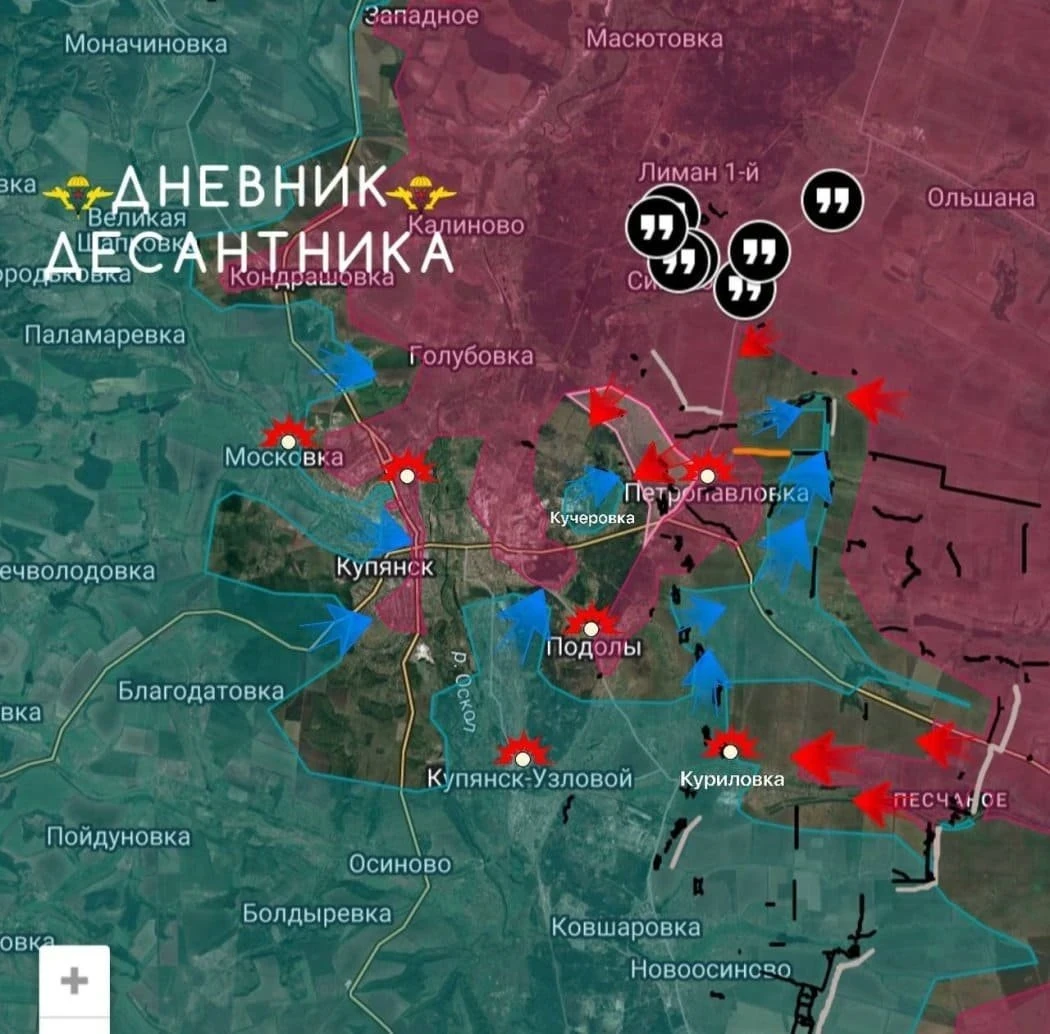 Опираясь на актуальные данные военкоров, можно констатировать, что в самом Купянске продолжаются вязкие городские бои. Вражеские диверсионно-разведывательные группы регулярно пытаются проникнуть в город с западной стороны - от Радьковки и Соболевки.