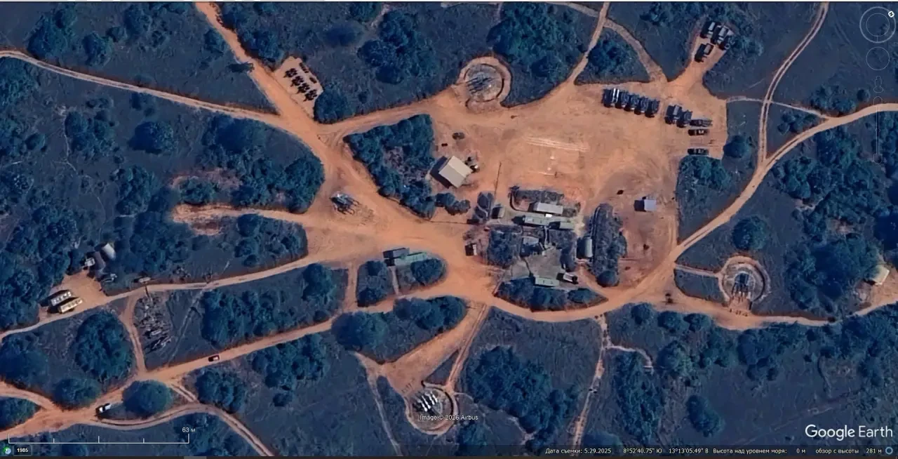 Спутниковый снимок Google Earth: позиция ЗРК С-75М3 западней авиабазы Меногве в провинции Квандо-Кубанго. Снимок сделан в апреле 2025 года
