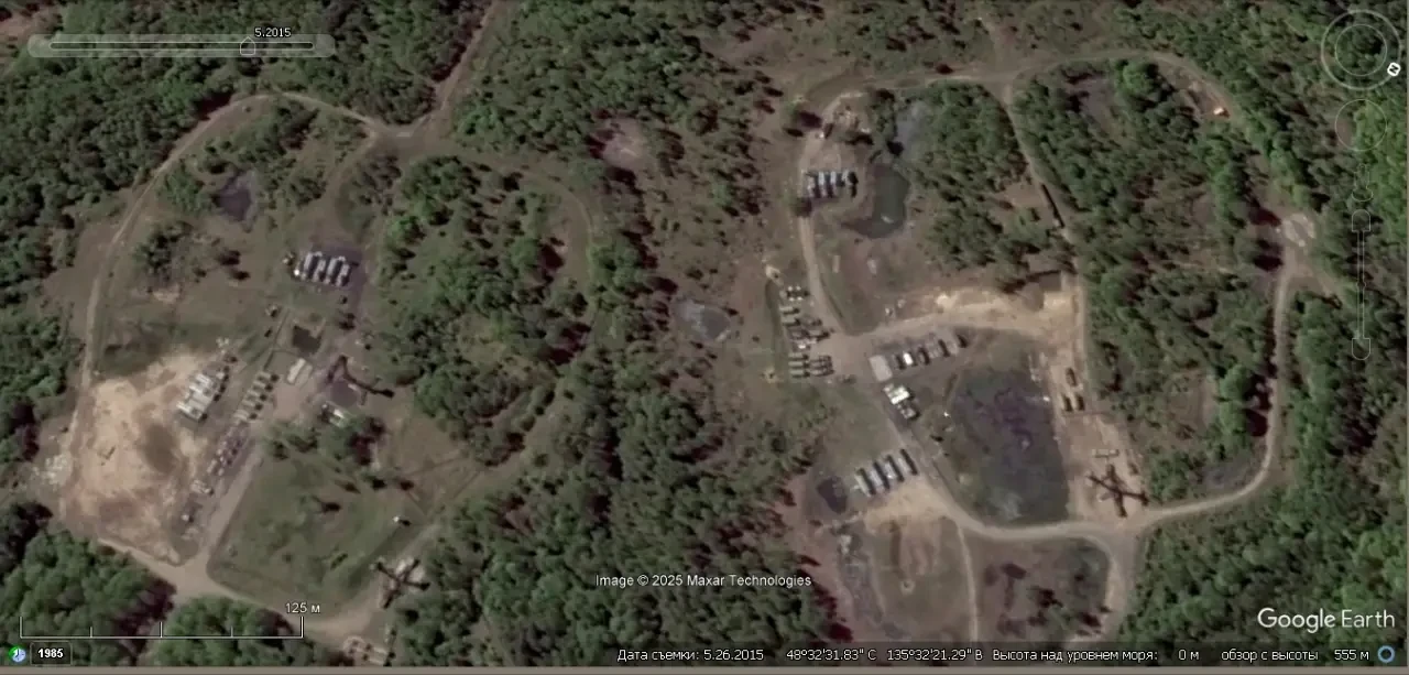 Спутниковый снимок Google Earth: бывшая позиция ЗРК С-200ВМ под Хабаровском. Снимок сделан в мае 2015 года