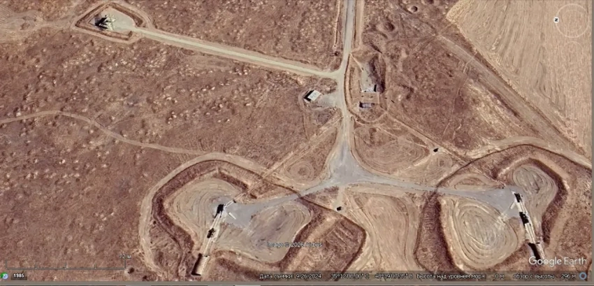 Спутниковый снимок Google Earth: ЗРК С-75М3 развёрнутый на бывшей позиции С-200ВМ в 10 км юго-восточней Актау. Снимок сделан в июне 2023 года
