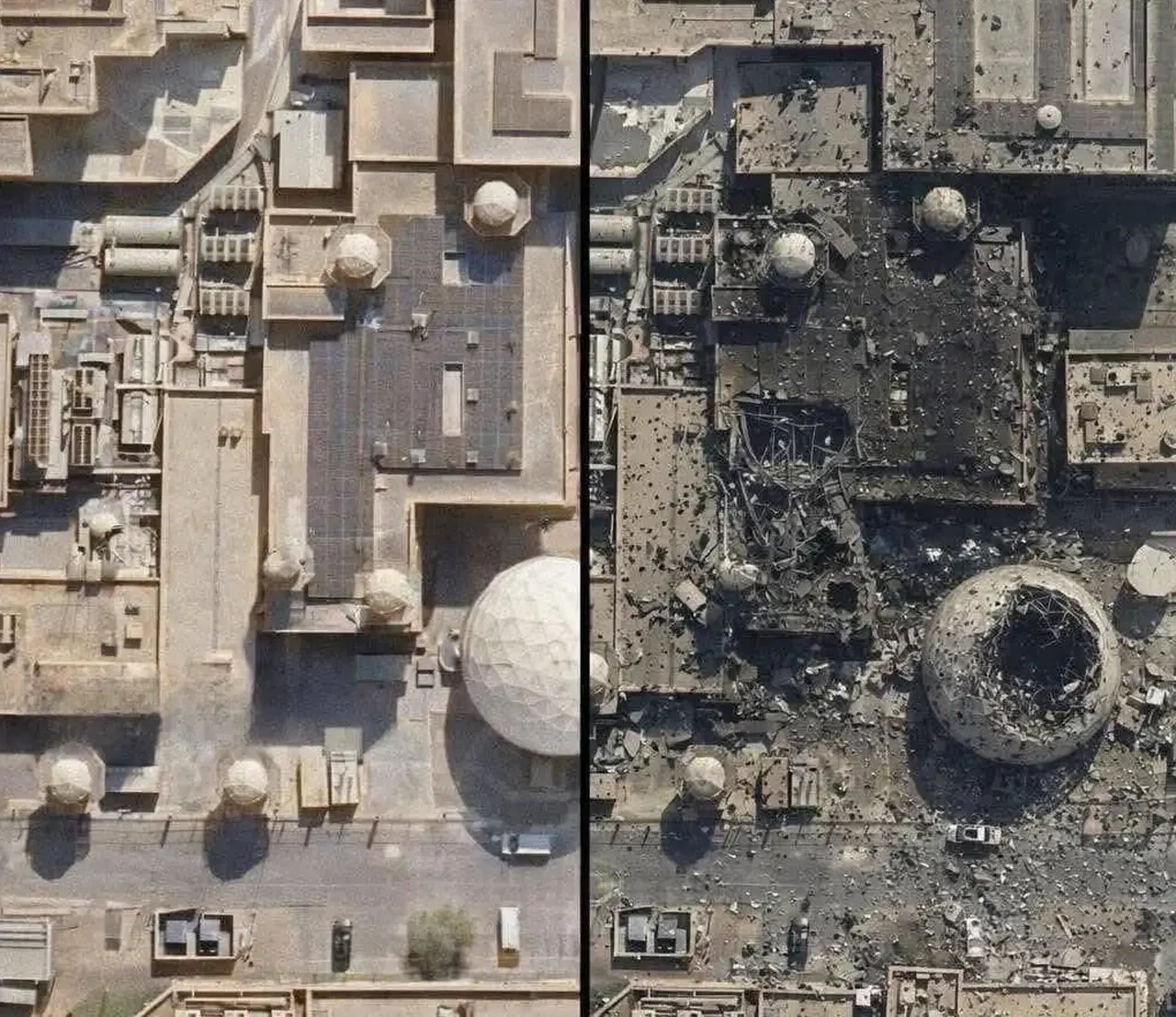 Иран спустя совсем непродолжительное время после нанесения удара по американскому радару в Катаре публикует детальные снимки последствий прилёта. На снимках можно видеть территорию американской военной базы «до» и «после». Причём на снимке в формате «после» видна зияющая дыра на куполе, который скрывал радар оценочной стоимостью не менее 1 млрд долларов.