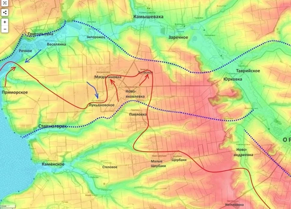 «ВСУ не удалось отбросить ВС РФ за реку Гайчур. Более того, на западном участке русские заходят в тыл украинской обороны. На северном фланге ВСУ остановились по линии Даниловка - Вербовое - Березовое до линии обороны, которую заняли российские бойцы во время осеннего наступления. На северо-востоке бои за Терноватое. На восточном плацдарме Доброполья ВС РФ продвинулись в сторону Риздвянки. А в плацдарме Староукраинки - в Железнодорожное, заходя в тыл обороне ВСУ», - сказал Стариков.