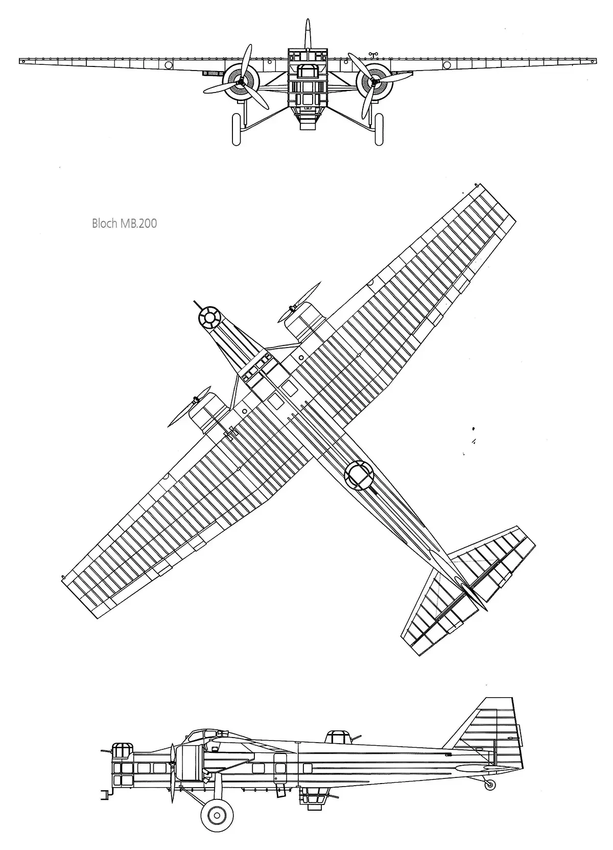 Как ни странно, о конструкции прототипа MB 200-01, как, впрочем, и последующих серийных машин известно немного. Вероятно, имелось конструктивное сходство с последующим MB 210, но, поскольку различались даже геометрические размеры, то вряд ли оно было значительным. Поэтому развернутого описания не будет — придется ограничиться весьма приблизительной компоновочной схемой из airwar.ru. Итак, на прототипе были установлены двигатели 14Kdrs под капотами NACA взлетной мощностью 750 л.с., номинальной 800 л.с. на высоте 3,85 км и кратковременной 850 л.с. на высоте 3,4 км. Насколько можно судить, двигателей противоположного вращения (например, 14Kdrs и 14Kgrs) на прототипе не было. Запас топлива составлял 1380 литров в четырех крыльевых баках.
