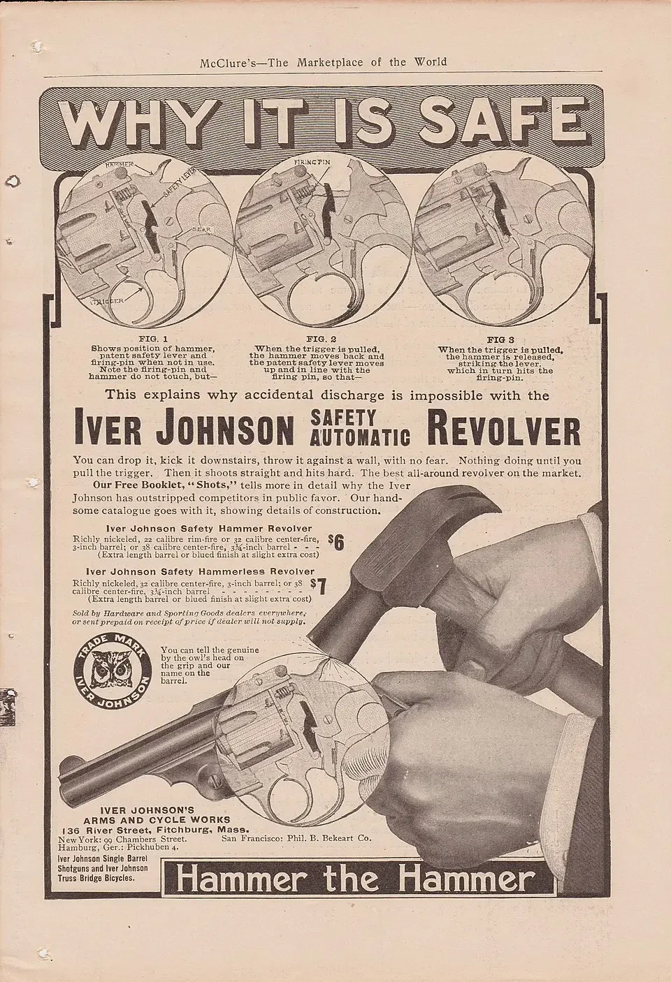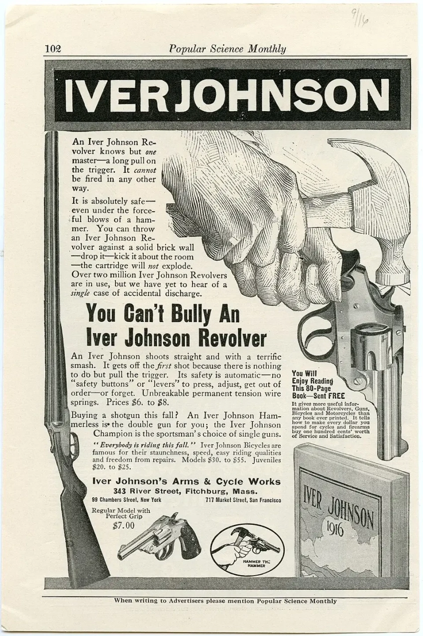 Рекламная листовка с текстом: «Бей молотом по курку. Мы подсчитали, что каждый мужчина, прошедший этот тест, в среднем приводит к нам трех новых клиентов — себя и как минимум двух своих друзей. Если вам нужен револьвер, который не выстрелит случайно, купите автоматический револьвер Iver Johnson с предохранителем…»