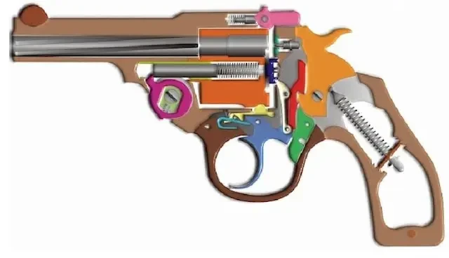 И вот Эндрю Фрайберг как раз и придумал простой и действенный предохранитель, сразу сделавший револьвер абсолютно безопасным. Курок его револьвера в спущенном состоянии просто не доставал до ударника в рамке и никак, ни под каким видом не мог по нему ударить. Но на курке имелась пластинка на фигурном выступе, которая поднималась при нажатии на курок и в тот момент, когда курок был сначала полностью отжат, а затем спущен, она становилась «прокладкой» между ним и ударником и позволяла передать удар на ударник и наколоть капсюль патрона, после чего сразу же опускалась. То есть после выстрела револьвер опять становится полностью безопасным, так что по его курку можно было даже стучать молотком!