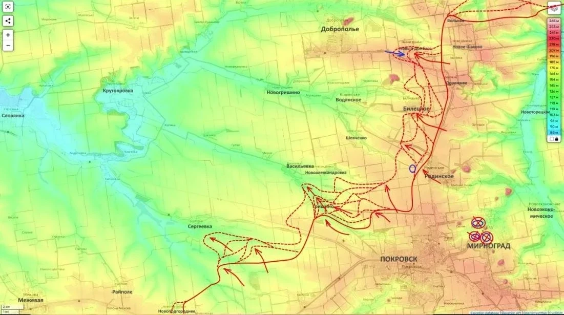 Кроме того, Вооружённые силы России планомерно расширяют зону мощного наступления в полосе ответственности группировки войск «Центр». Наиболее заметная динамика на Покровско-Добропольском направлении наблюдается в районе населённого пункта Гришино, где российские части уверенно закрепляются на новых рубежах.