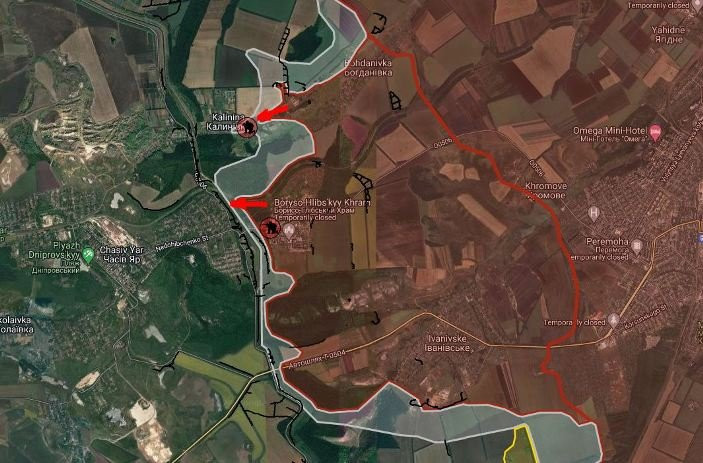 По данным Telegram-канала "БелВПО" на ЧасовЯрском направлении ВС РФ продолжает попытки продвинуться в восточной части Калиновки и давят в урочище Орлова в направлении канала «Северский Донец-Донбасс». Российские войска закрепились в оставшейся части микрорайона «Канал».