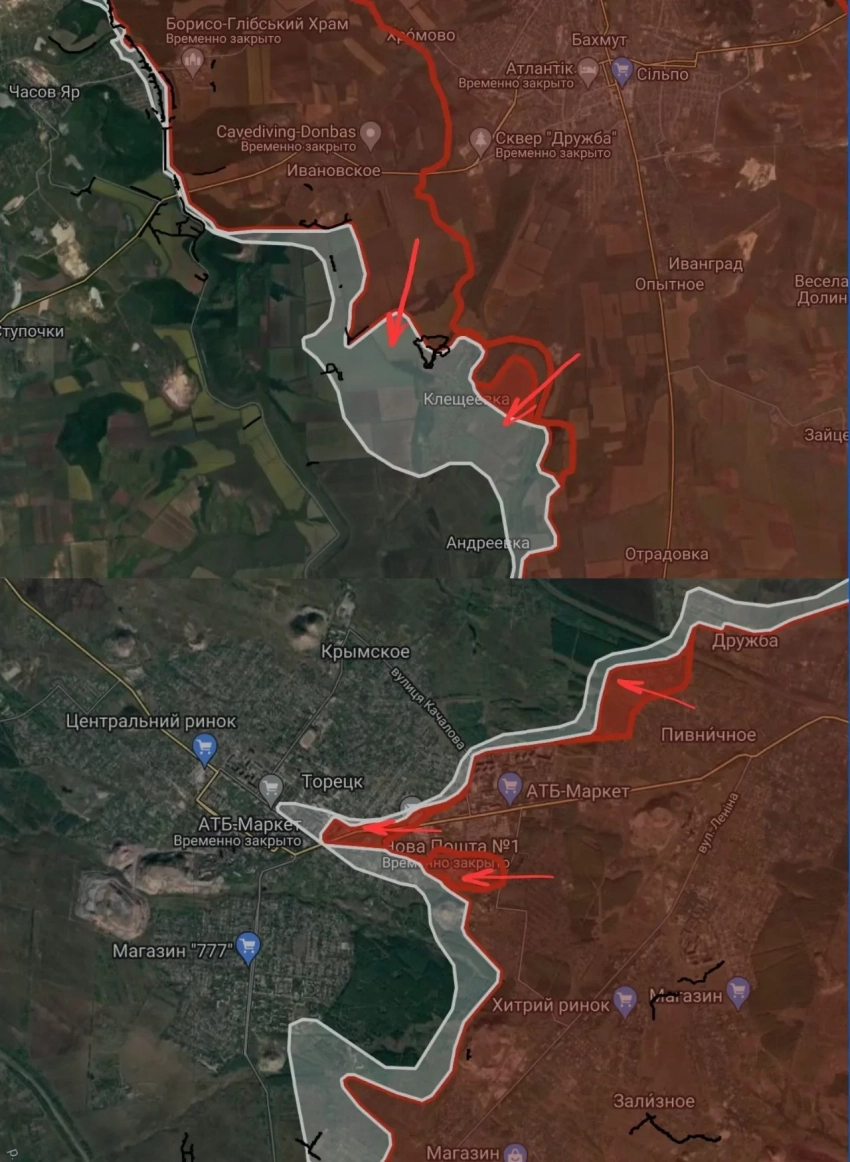 На ЧасовЯрском направлении ВС РФ имеют тактические успехи восточнее Клещеевки продвинулись до 1.05 км и давят южнее Ивановского и западнее Клещеевки.