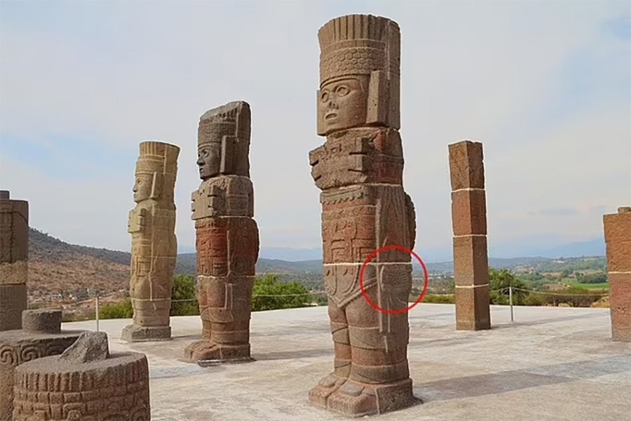 Гигантские каменные статуи в Туле также изображают фигуры, прижимающие к себе сумочку — конструкции были созданы в 750 году нашей эры.