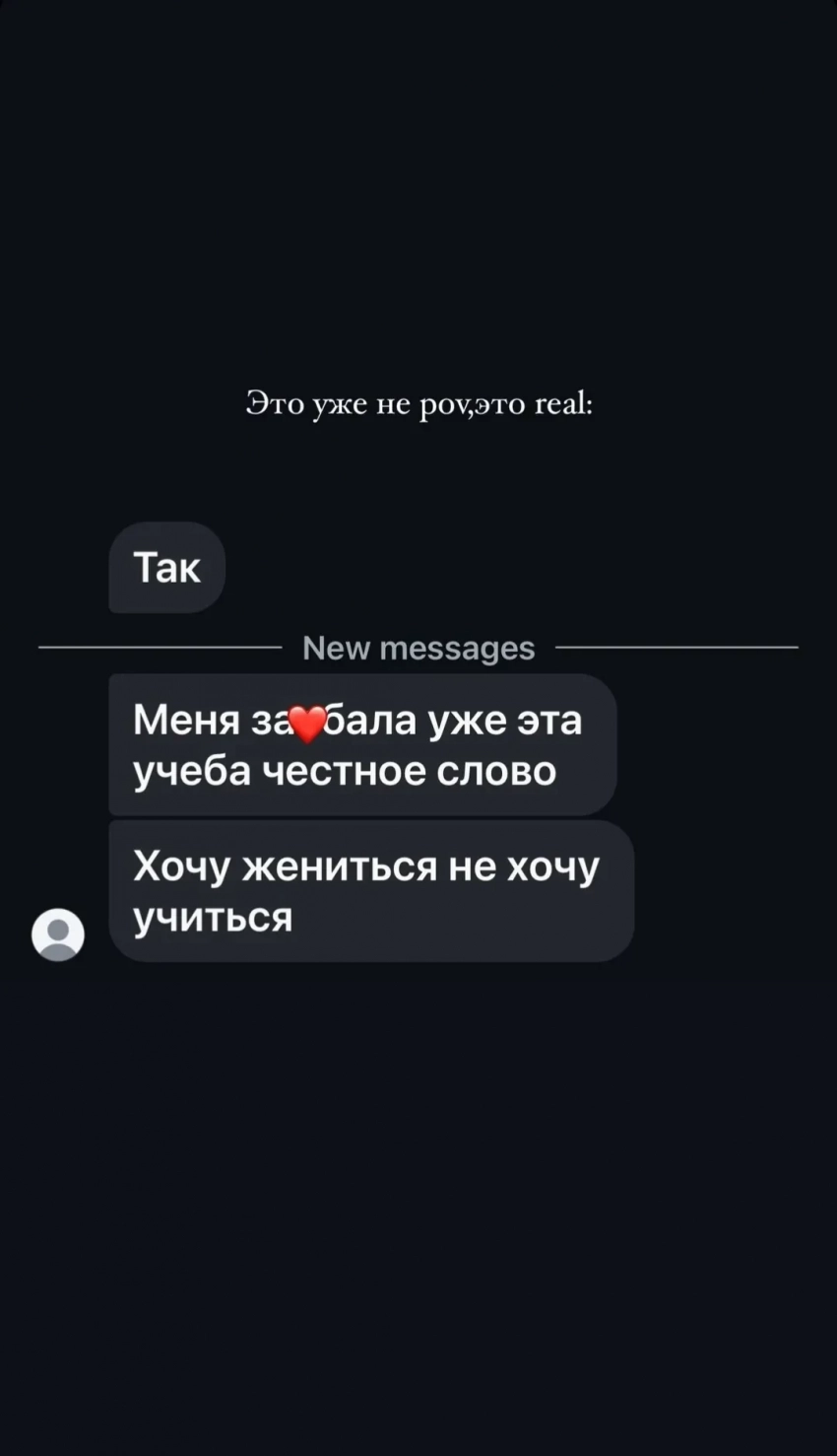 Киба опубликовала переписку, в которой собеседник пожаловался, что устал учиться: "Хочу жениться, не хочу учиться". На это Аврора написала: "Это уже не pov, а real" [реальность].