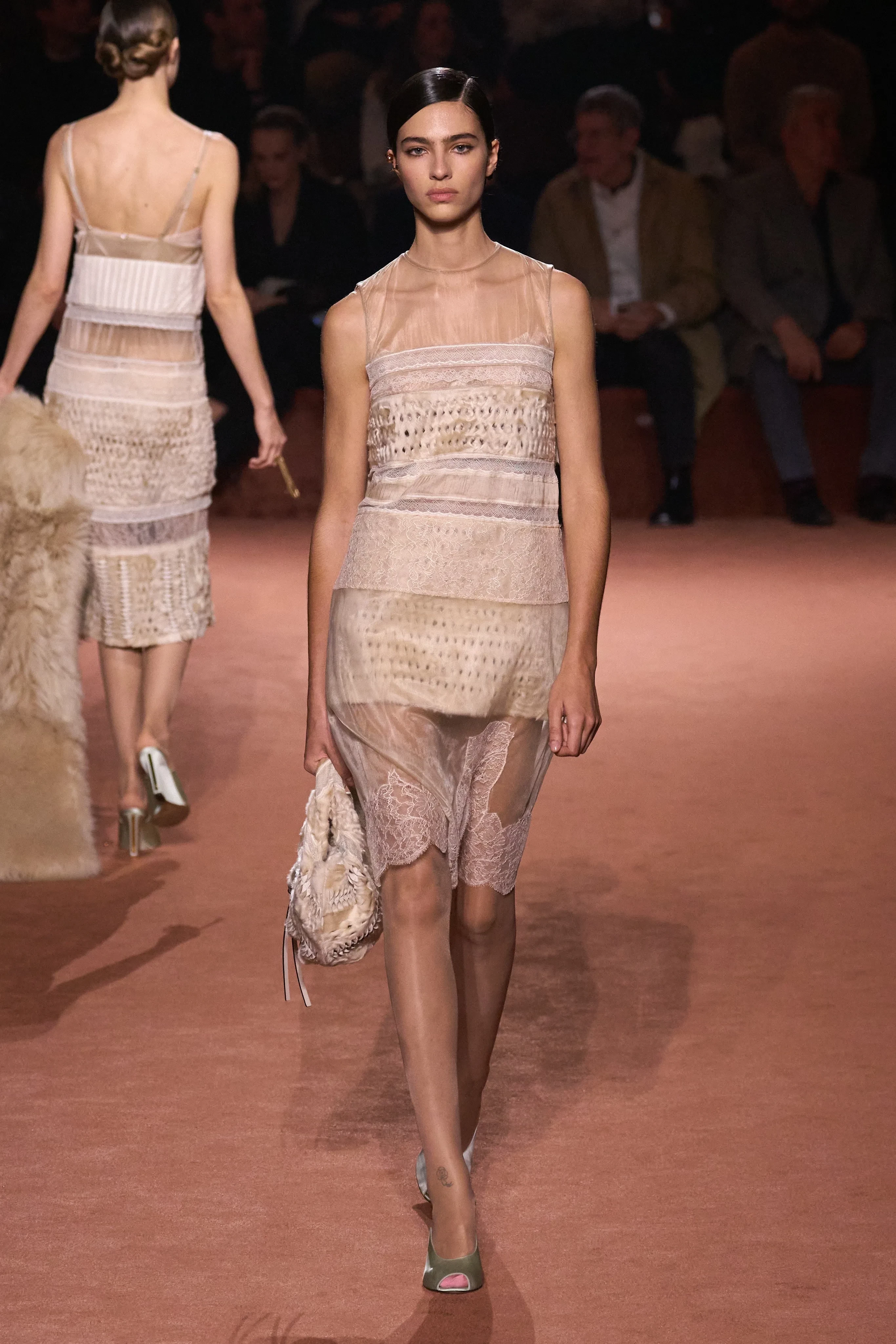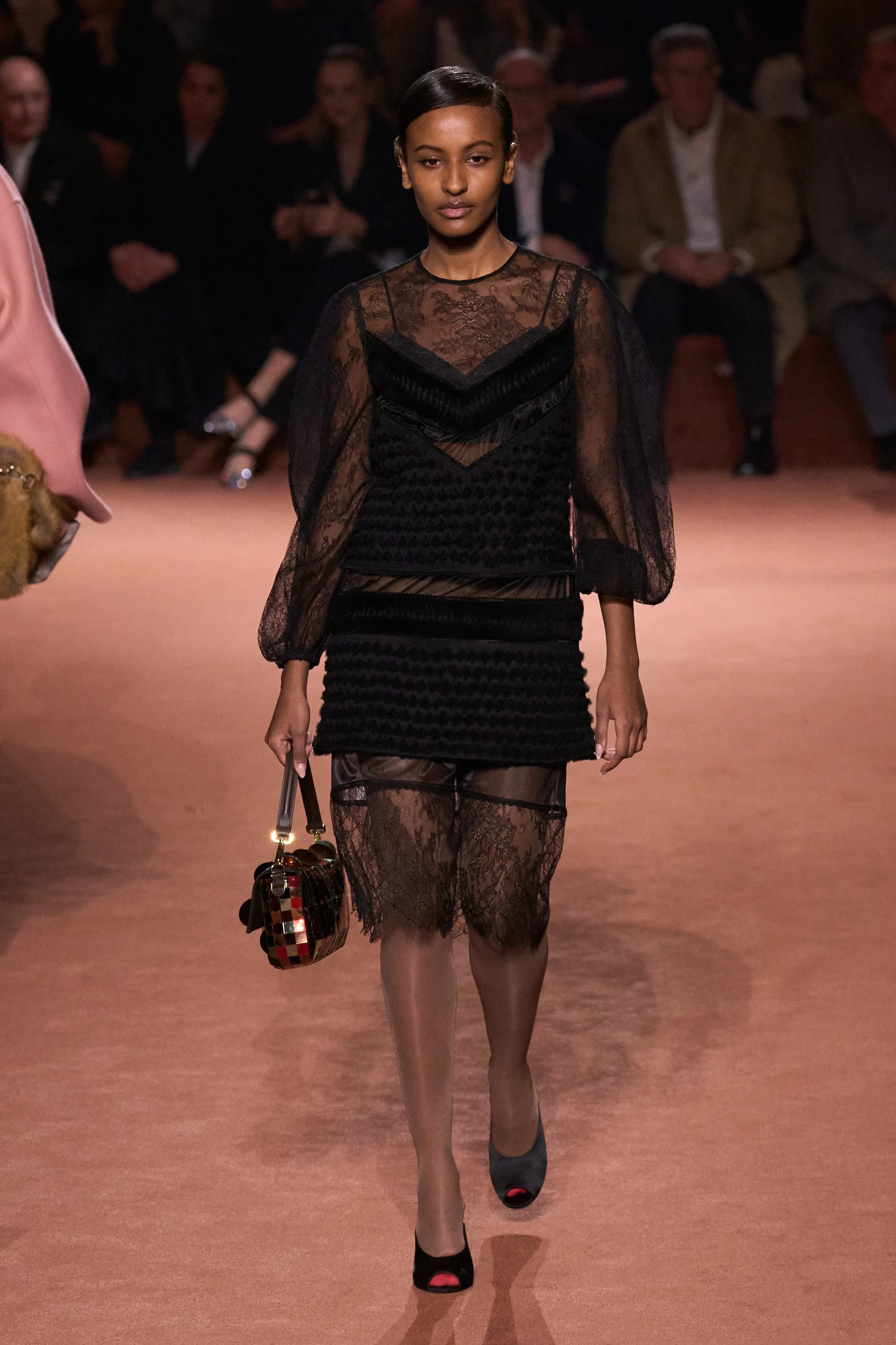 Креативный директор модного дома Сильвия Вентурини-Фенди представила коллекцию из 85 луков. Главный акцент она сделала на меховых изделиях и вышивке из драгоценных камней, которыми были расшиты юбки, платья, пальто и обувь. В коллекции также много вещей из кожи, полупрозрачных тканей и "возрастных" силуэтов. Яркой деталью образов стали телесные капроновые колготки с мысами разных оттенков, которые "выглядывали" из туфель.