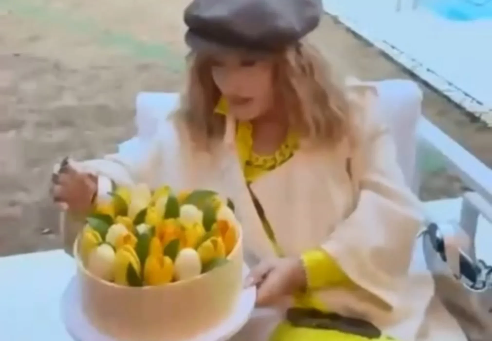 Максим Галкин* показал, как его супруга Алла Пугачёва отметила первое воскресенье весны. Шоумен опубликовал видео в своём инстаграме**, в котором 75-летняя певица сидит за столиком у бассейна и демонстрирует праздничный торт в виде букета из жёлтых и белых тюльпанов. В описании Галкин лаконично написал: "Торт", добавив эмодзи с цветами и ромашкой.