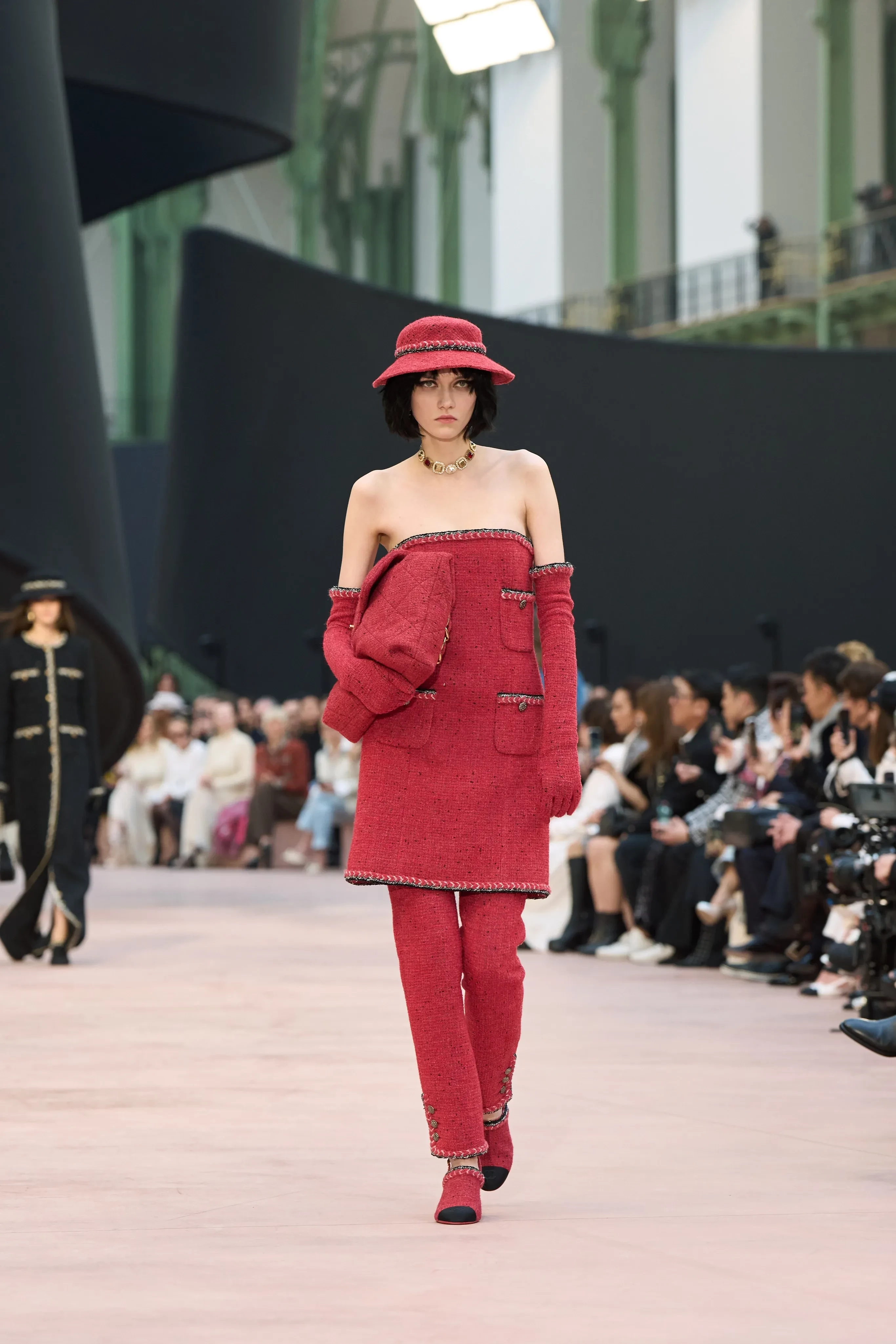 https://t.me/spletnikru2024/26433В новой коллекции дизайнеры представили твидовые платья с прозрачной юбкой, костюмы из вельвета, вязаные свитера-платья, а многие изделия украшали банты, которые сейчас в тренде. Также внимание привлекли массивные жемчужные бусы и шляпы.