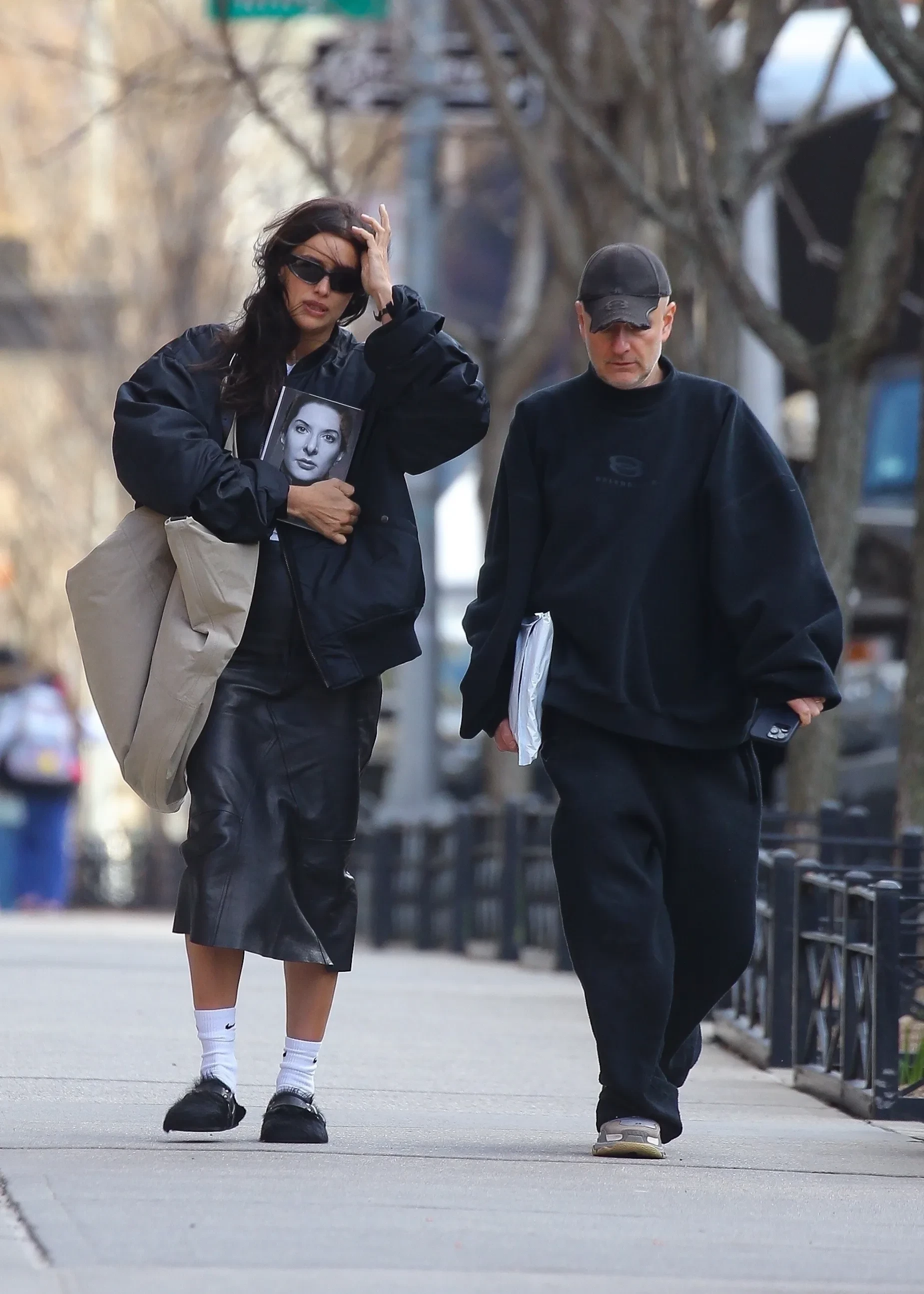Российскую супермодель Ирину Шейк засняли с другом в Нью-Йорке. На прогулку 39-летняя модель вышла в бомбере, кожаной юбке и мюлях с мехом (их Шейк носит не на голую ногу, а с носками Nike). Главным "аксессуаром" образа стала книга — мемуары "Пройти сквозь стены" Марины Абрамович, знаковой фигуры современного искусства XX века, которую ещё называют "бабушкой искусства перформанса".