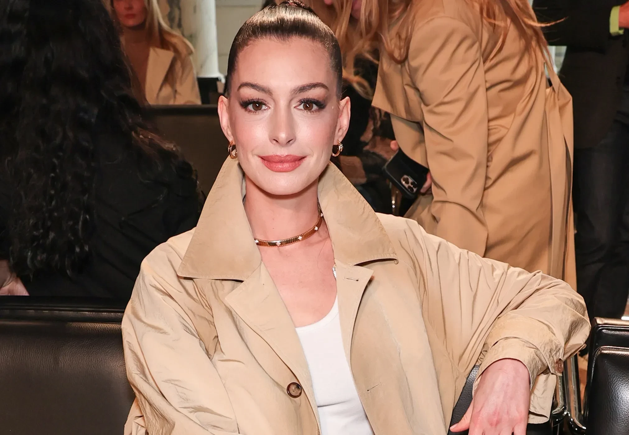 Хэтэуэй сидела в первом ряду шоу: для выхода в свет она выбрала бежевый тренч и брюки в цвет, расшитые пайетками, образ завершал простой белый топ. Однако комментаторов в сети больше привлекло лицо актрисы: многие считают, что она прибегла к услугам пластического хирурга, и сравнивают её "новую" внешность с внешностью Линдси Лохан, которую также подозревают в проведении пластической операции. Впрочем, нашлись и те, кто решил, что всё дело в удачной укладке: "Если она сделала операцию, то результат блестящий. Но давайте не будем недооценивать силу подтяжки лица с помощью тугого хвоста", — написал один из пользователей Reddit.