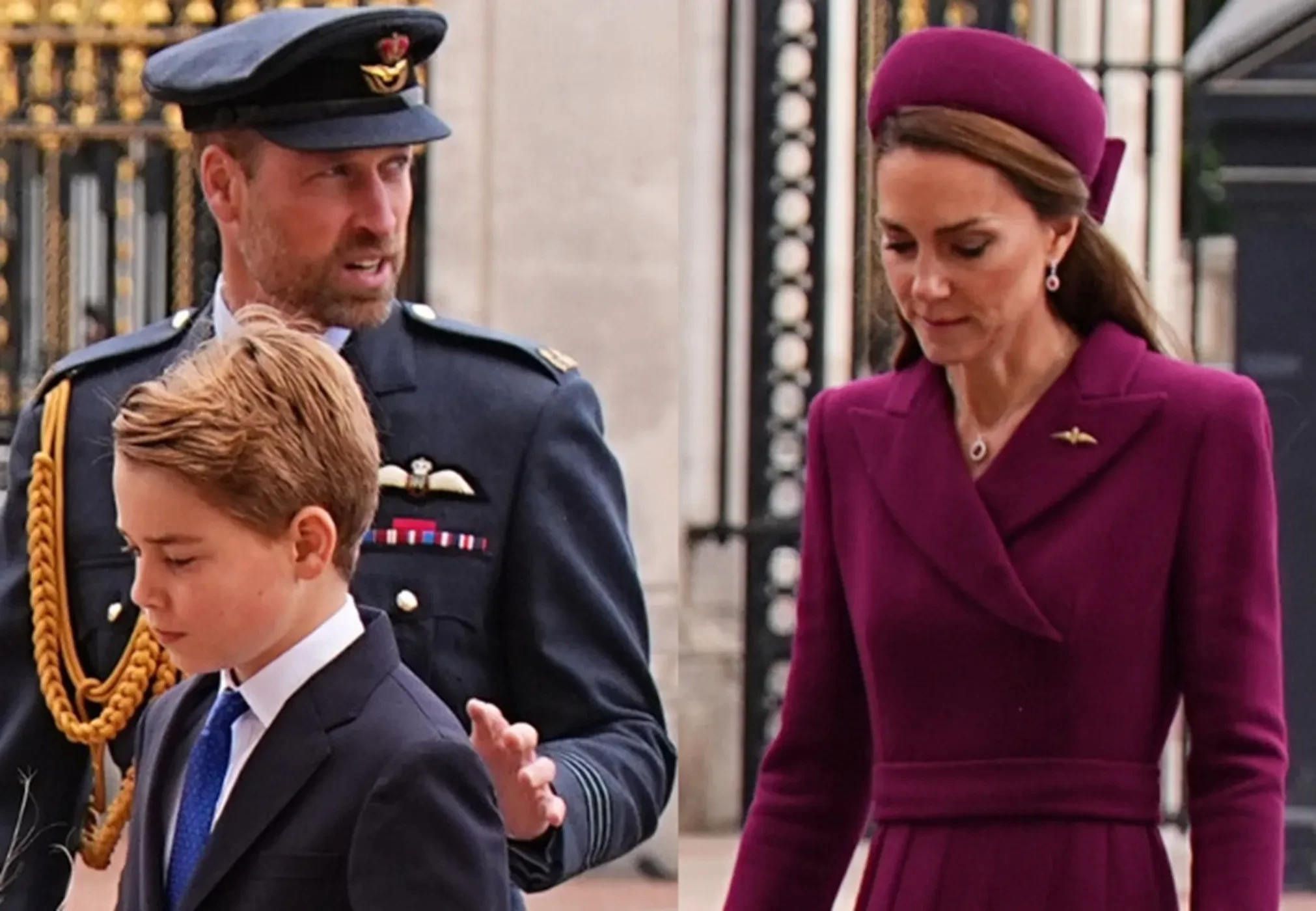 43-летняя принцесса Уэльская появилась перед публикой у мемориала королевы Виктории возле Букингемского дворца в фиолетовом платье-пальто и шляпке-фасинаторе в тон. 42-летний принц Уильям был в военной форме, на 11-летнем Джордже, 10-летней Шарлотте и семилетнем Луи были строгие тёмно-синие наряды.