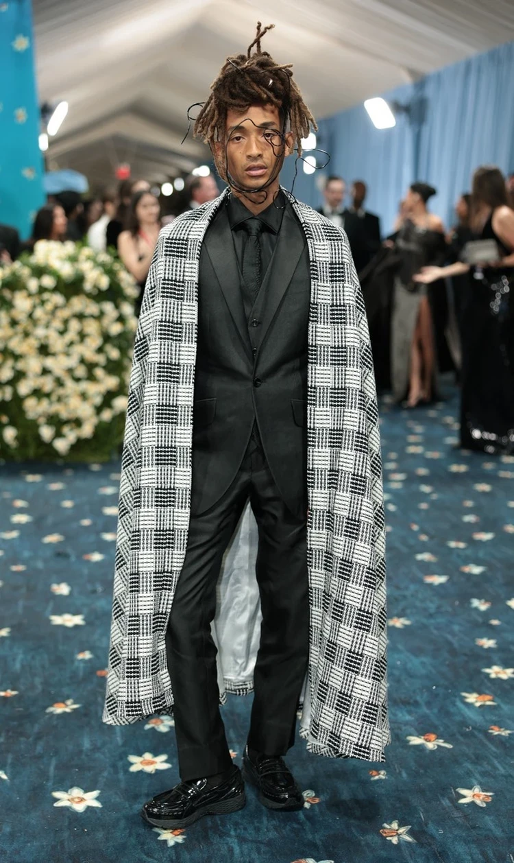 Сын Уилла Смита Джейден в этот раз решил обойтись без «дома» на голове, но головной убор все равно был при нем, а точнее проволока, обвивающая лицо парня. Поверх костюма 26-летний Джейден накинул нечто, похожее на плед в клетку.