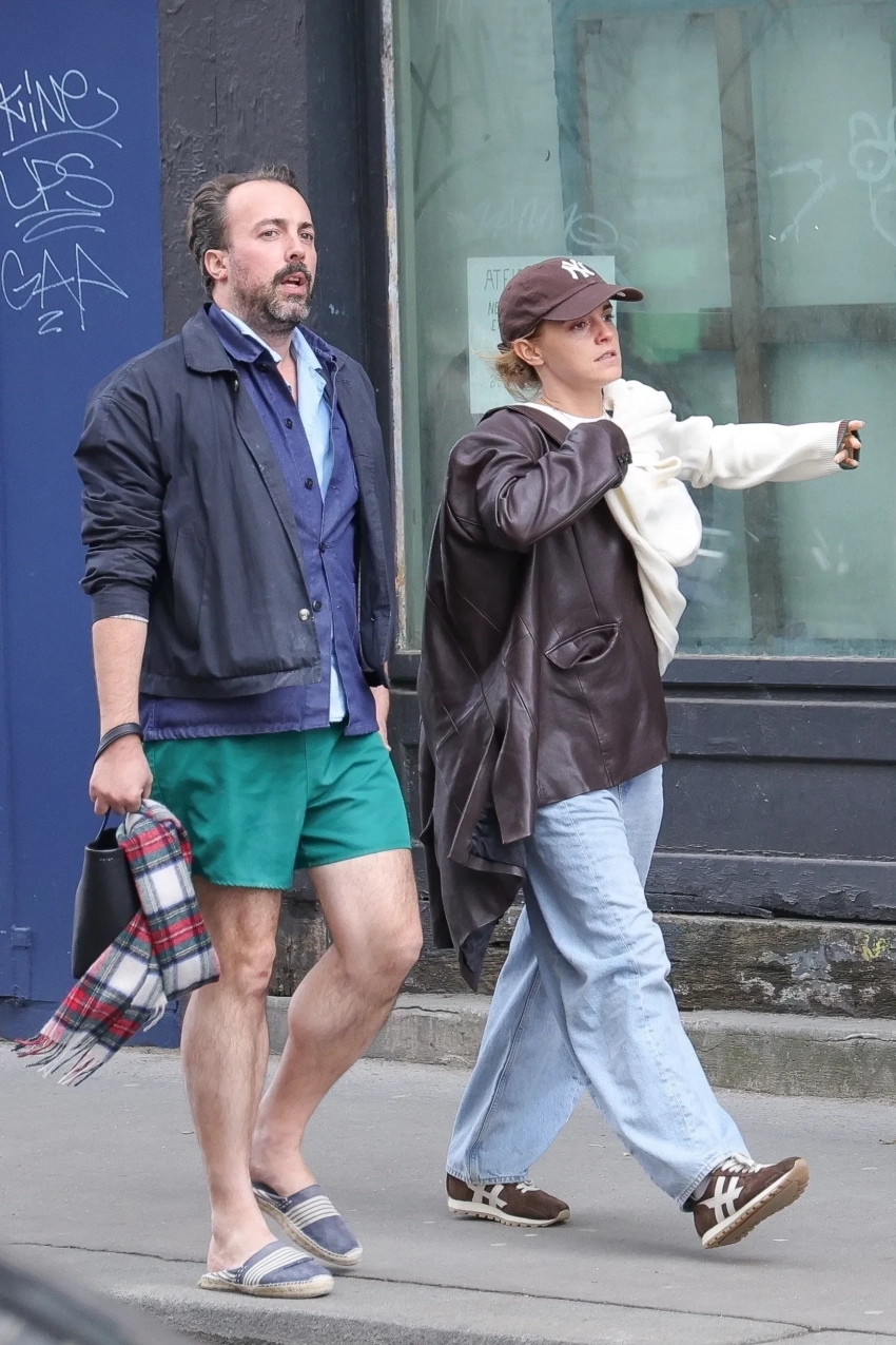 Для выхода на публику 35-летняя актриса выбрала коричневую кожаную куртку, надетую поверх белого лонгслива, и свободные джинсы. Её образ дополнили кепка и кеды в тон верхней одежде. Спутник Эммы предстал в неоднозначном наряде: несколько надетых друг на друга рубашек, сверху ветровка, короткие бирюзовые шорты и обувь, напоминающая домашние тапочки.