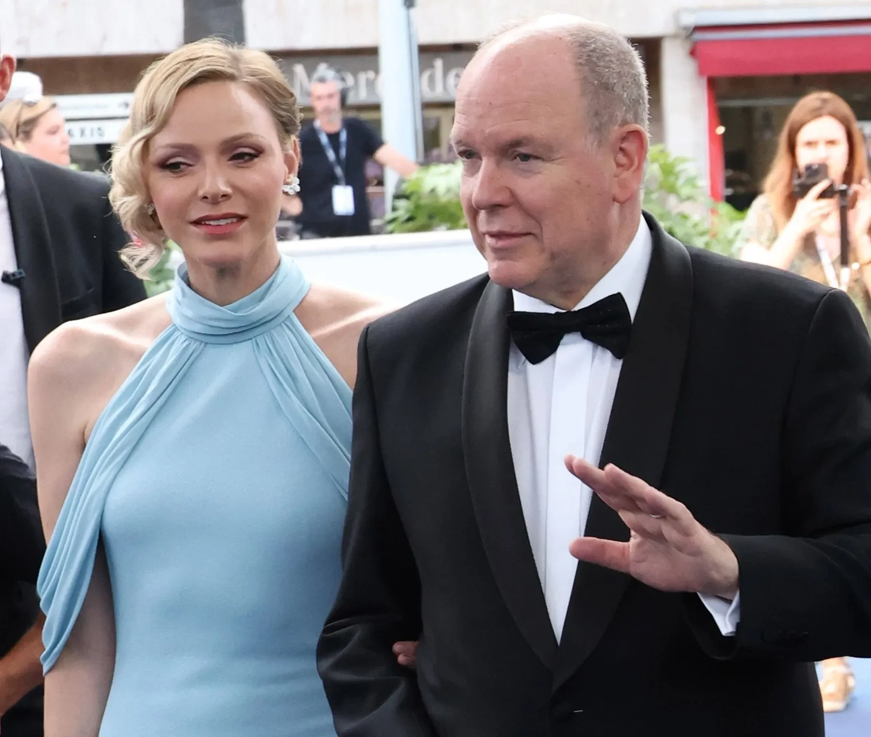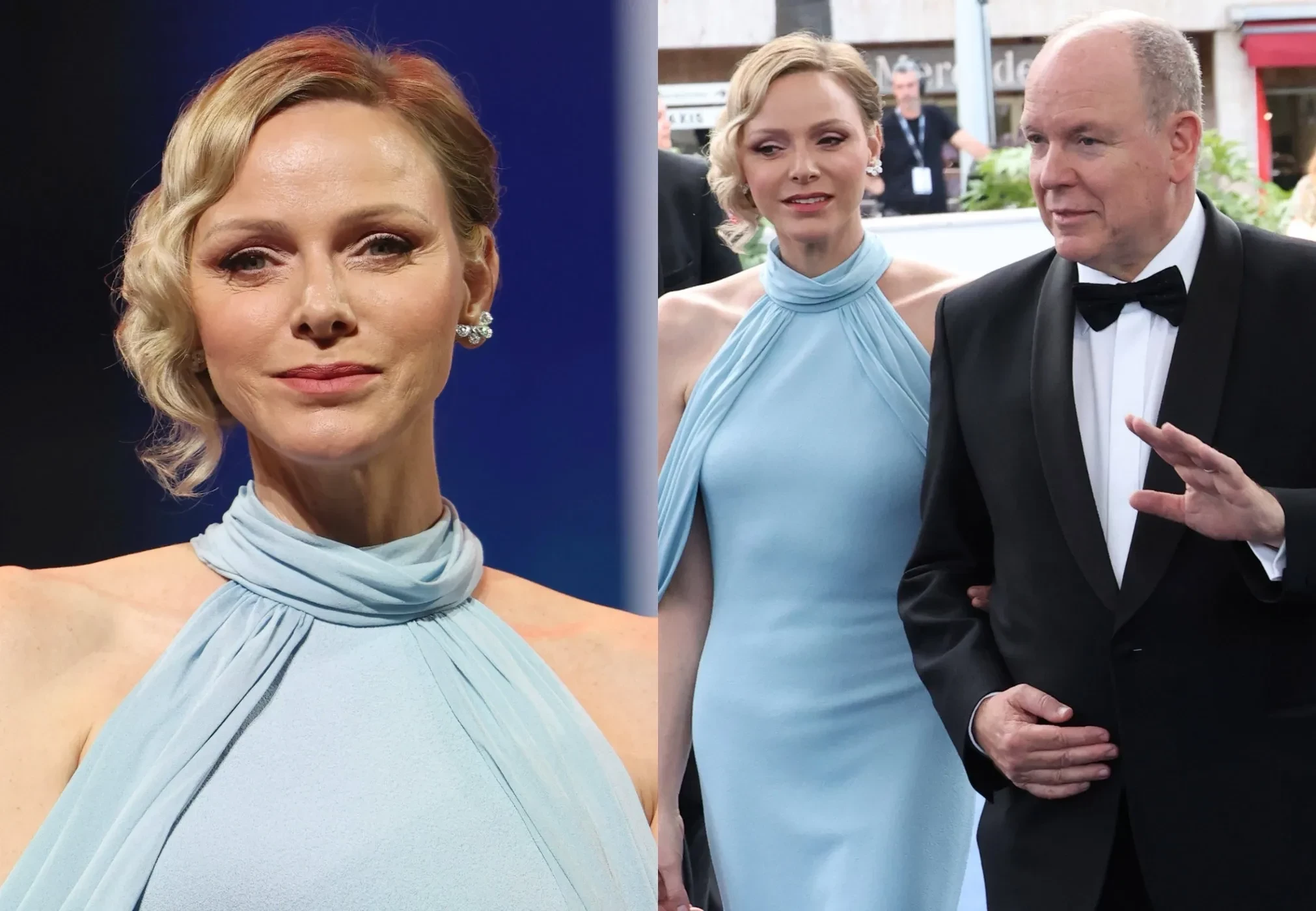 47-летняя Шарлен прошлась по дорожке под руку с супругом в голубом платье в пол, а 67-летний князь Монако надел на мероприятие чёрный смокинг с бабочкой. На церемонии пара поднялась на сцену, чтобы вручить американской актрисе Робин Райт награду "Золотая Нимфа".
