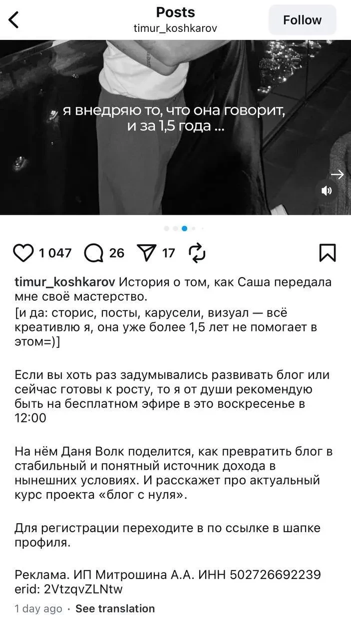 Телеграм-канал "Светский интроверт" обратил внимание на то, что в сети продолжается активная реклама курсов Митрошиной и её старых видеороликов. Также в своём аккаунте их публикует муж Митрошиной, 30-летний Тимур Кошкаров. Недавно он опубликовал пост, в котором рассказал, что Митрошина передала ему "своё дело". Поскольку ей запрещено пользоваться интернетом, муж продолжает развивать её аккаунт. Тимур приглашает подписчиков принять участие в курсах по блогерству, которые до этого вела Александра. Ранее подобных постов в блоге у него не было, так как он работал тренером по йоге.