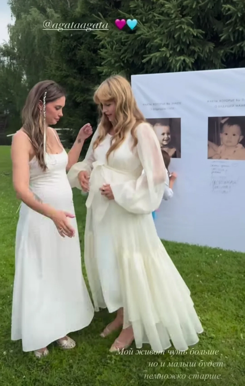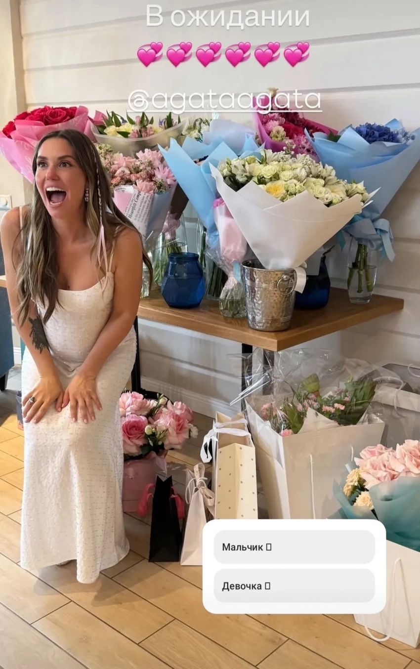 В своих соцсетях Агата опубликовала фотографии и видео с праздника, на который пригласила Наталью Земцову, Анну Банщикову, Елену Дудину и других звёздных друзей. Перед тем, как раскрыть приглашённым главную интригу вечера, она предложила гостям отдать свой голос за мальчика или девочку. Сама Муцениеце проголосовала за девочку. Именно её, скорее всего, звезда и ждёт, судя по попавшим на видео деталям (розовая сахарная вата, розовый букет цветов в руках у Петра Дранги). Однако официального объявления Муцениеце ещё не делала.