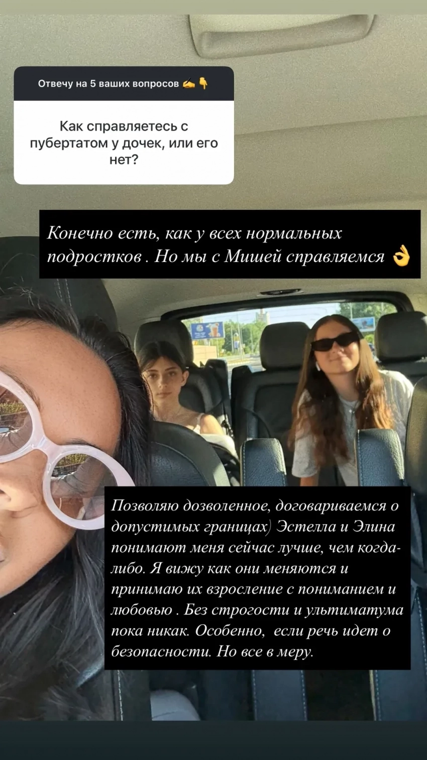 Во время популярной у блогеров рубрики "вопрос-ответ" фолловеры поинтересовались, как она справляется с воспитанием дочерей-подростков — 14-летней Эстеллы и 13-летней Элины. Виктория не стала скрывать, что ей помогает бывший супруг: "Мы с Мишей справляемся. Без строгости и ультиматума пока никак. Особенно если речь идет о безопасности. Но всё в меру".
