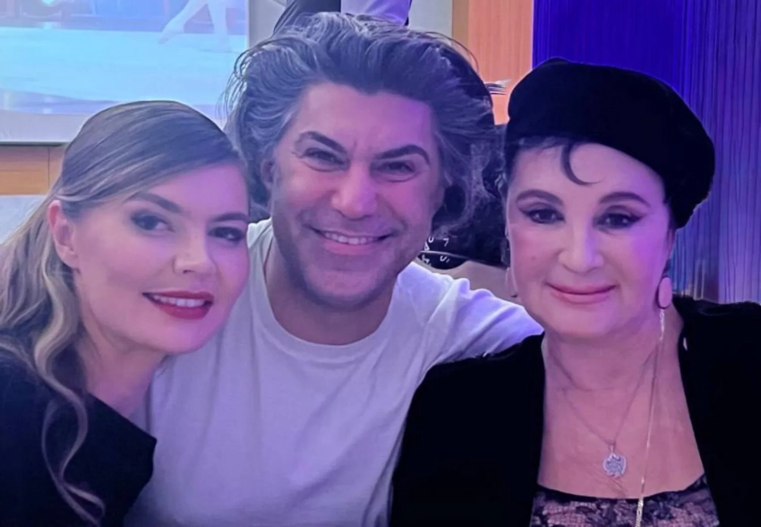 На снимке Цискаридзе сидит за столом и с одной стороны обнимает Ирину Винер, а с другой — Алину Кабаеву. Все трое улыбаются и смотрят в камеру.