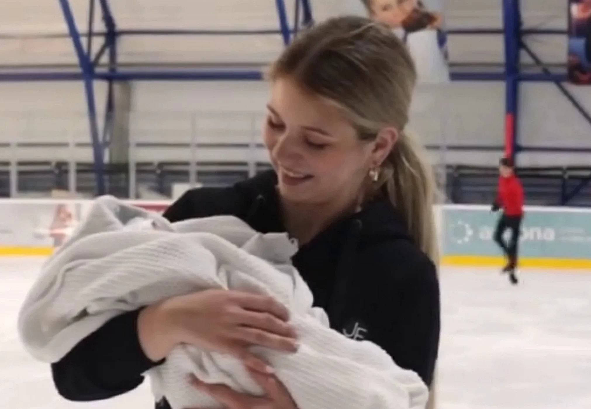21-летняя Александра Трусова вышла на лёд с новорождённым сыном. Спортсменка опубликовала в своих соцсетях видео, запечатлевшее её на коньках и с малышом на руках.
