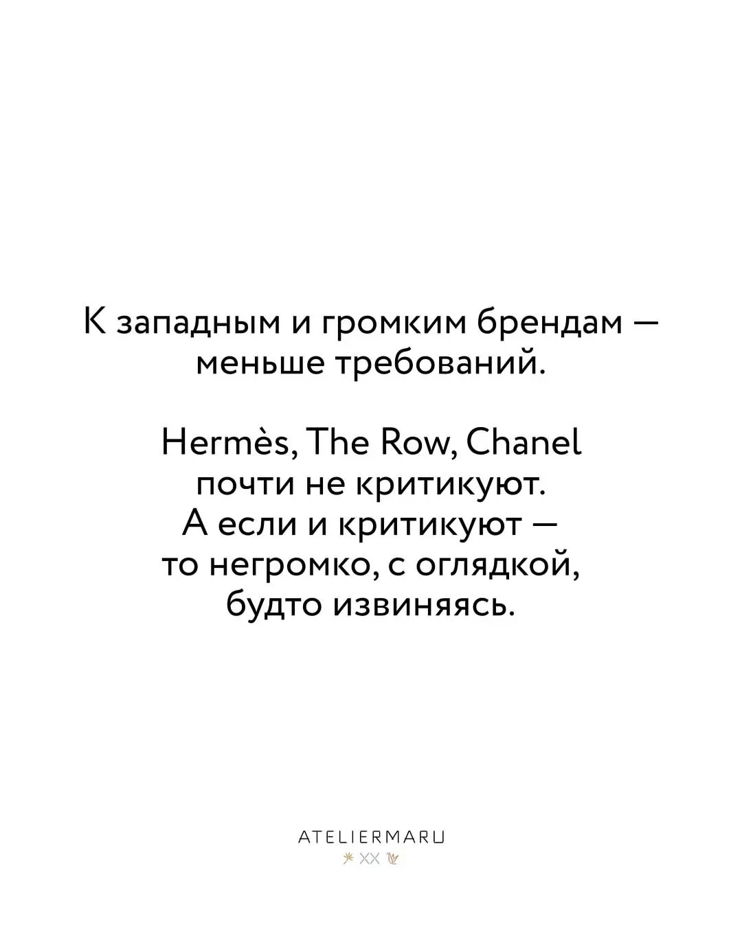 "Иногда кажется, что российский бренд должен не просто шить, а сдать ЕГЭ, пройти полиграф и принести справку от французского маркетолога. Проверяют всё: нитку, почерк в письме, номер заказа. К западным и громким брендам меньше требований. Hermes, The Row, Chanel почти не критикуют, а если критикуют, то негромко, с оглядкой, будто извиняясь", — написала Логвинова.