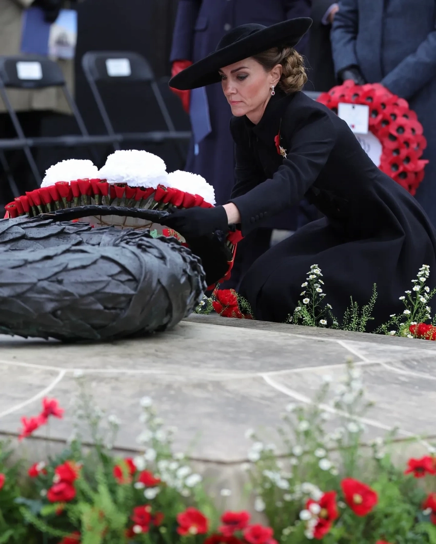 На мероприятии 43-летняя принцесса Уэльская появилась в чёрном платье-пальто Catherine Walker. Образ она дополнила шляпой с широкими полями Jane Taylor, короткими перчатками и сапогами на каблуке Gianvito Rossi. Из украшений Кейт выбрала серьги с бриллиантами и рубинами, брошь Ирландской гвардии и традиционный красный мак.
