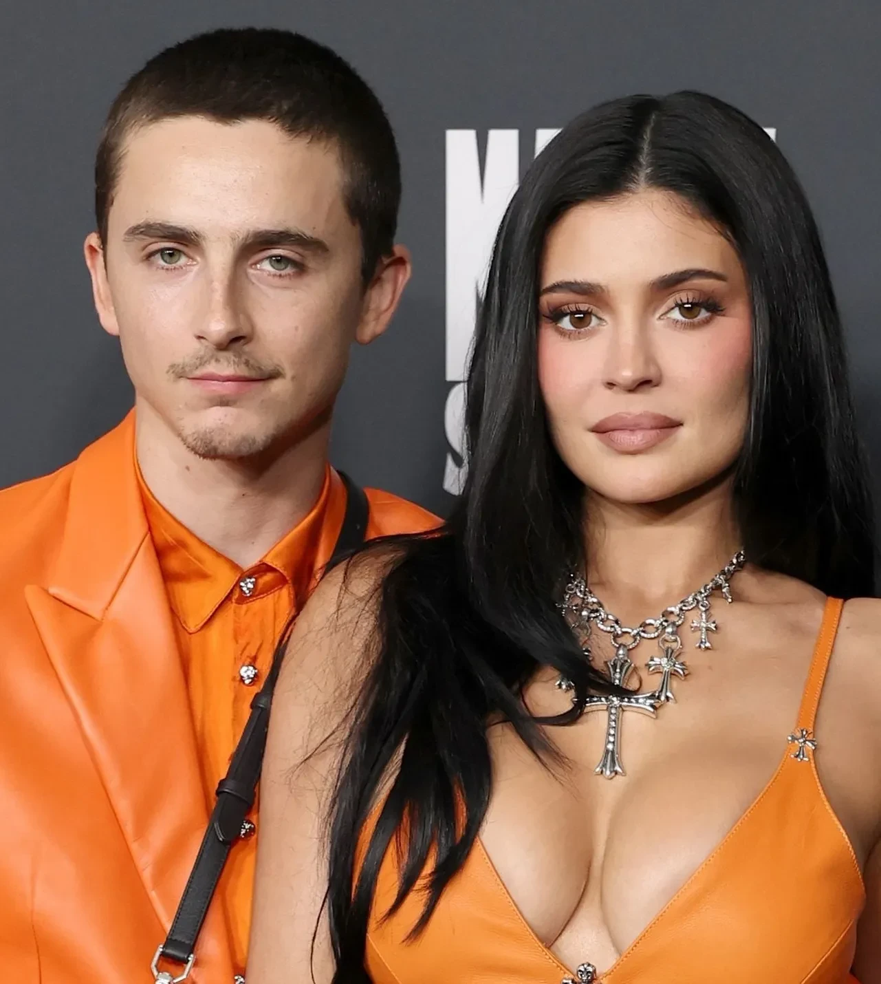 29-летний Шаламе и его возлюбленная позировали в оранжевых парных образах Chrome Hearts. Актёр надел кожаный костюм и сумку в форме ракетки для пинг-понга — это отсылка к роли, которую он играет в фильме. 28-летняя Кайли Дженнер позировала в платье с декольте и открытой спиной.