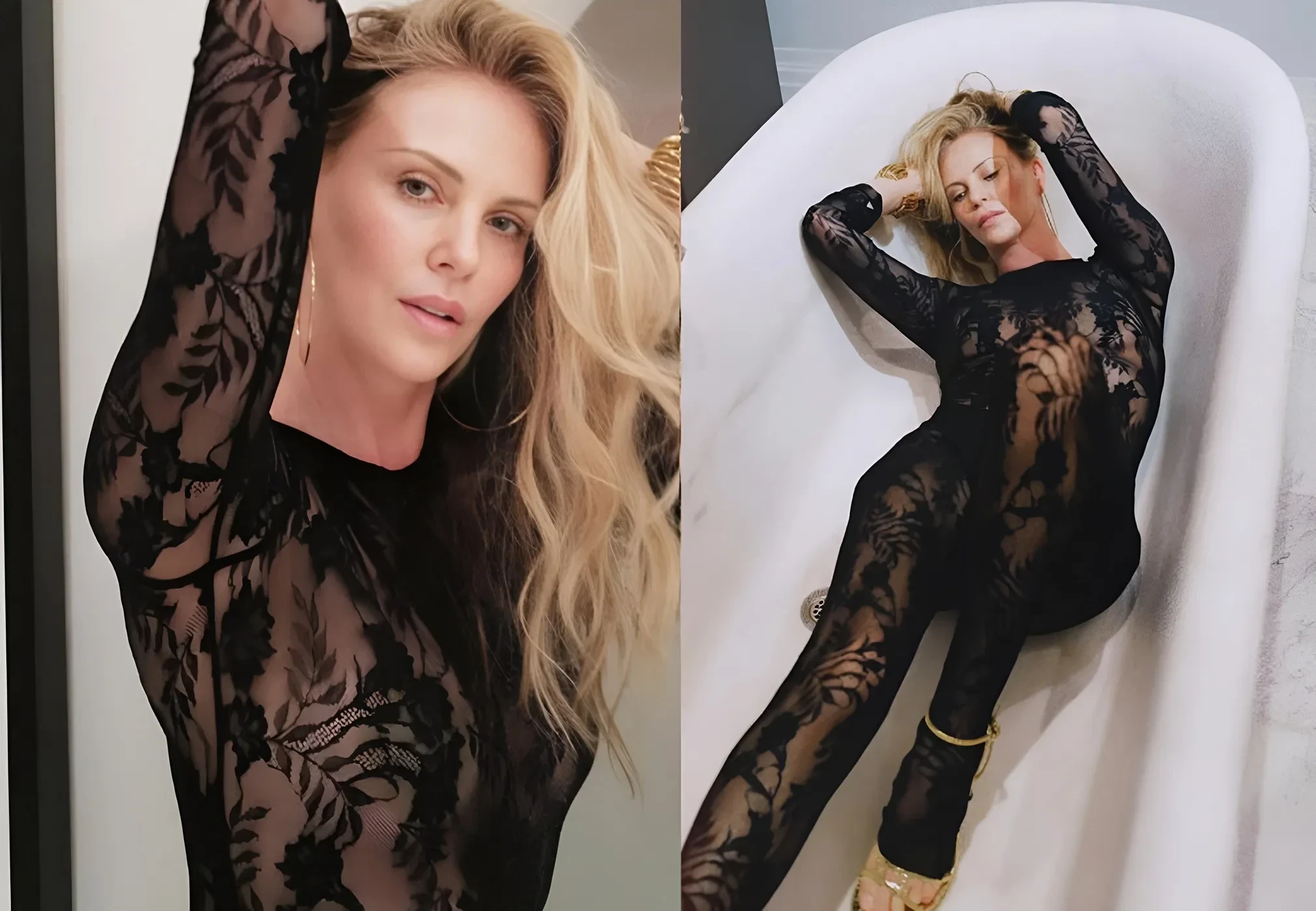 50-летняя Шарлиз Терон снялась в кружевном комбинезоне на голое тело. Снимки она опубликовала в своём инстаграме*, пояснив, что сделала оммаж на культовую фотомодель Джерри Холл, у которой была похожая съёмка.