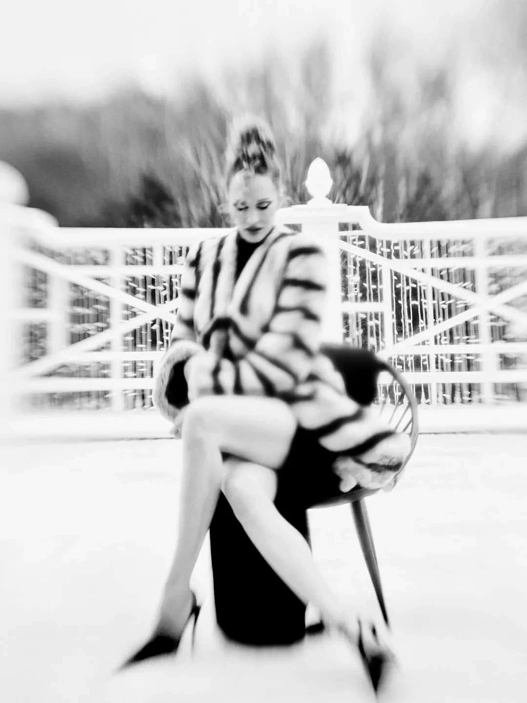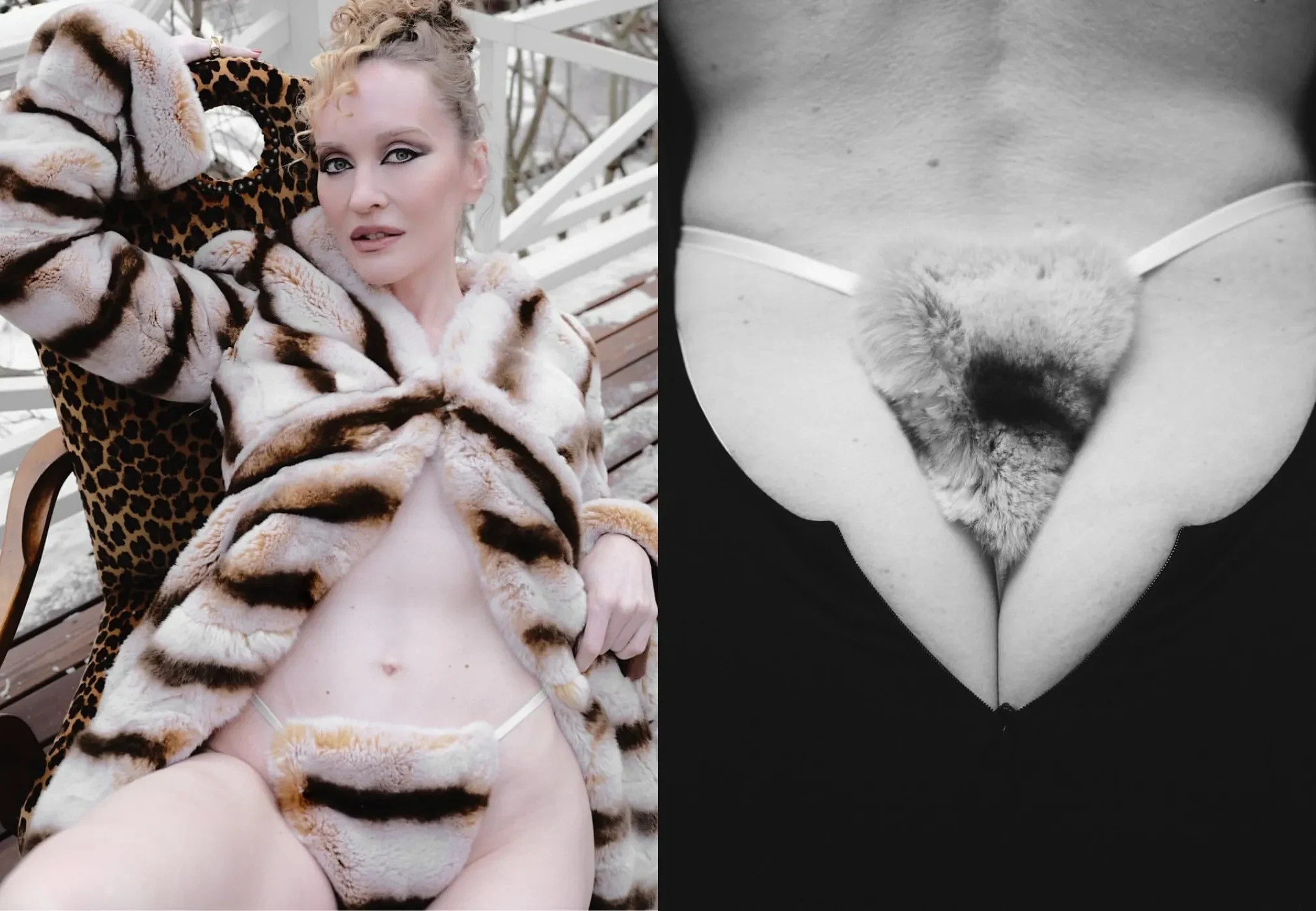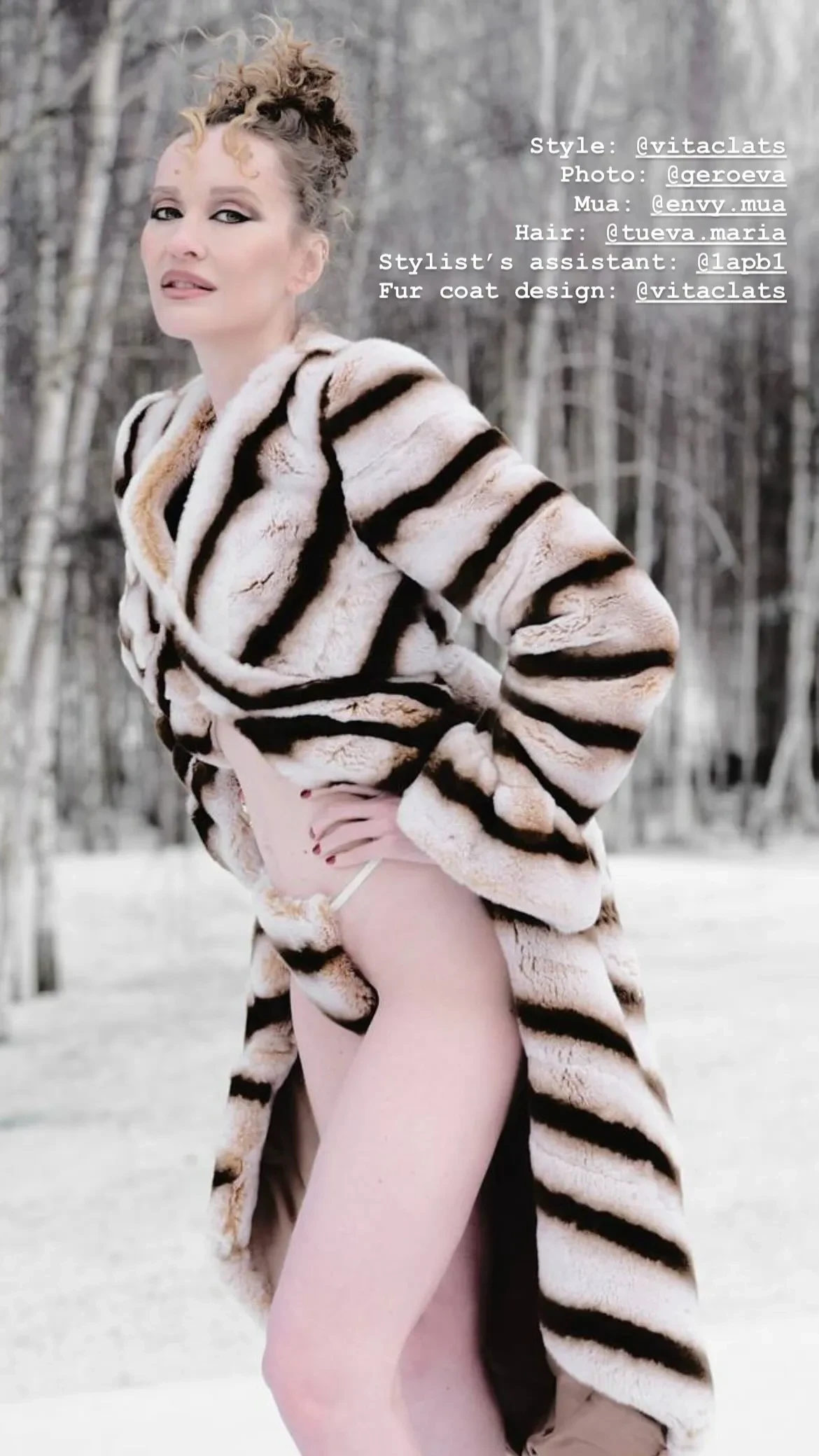 На фотографиях супруга миллиардера Ивана Стрешинского позирует в снежном лесу в шубе в полоску и трусах в тон. Также для фотосессии Давыдова примерила бельё и чёрное облегающее платье с глубоким вырезом на спине. "Девице не холодно", — подписала снимки светская львица.