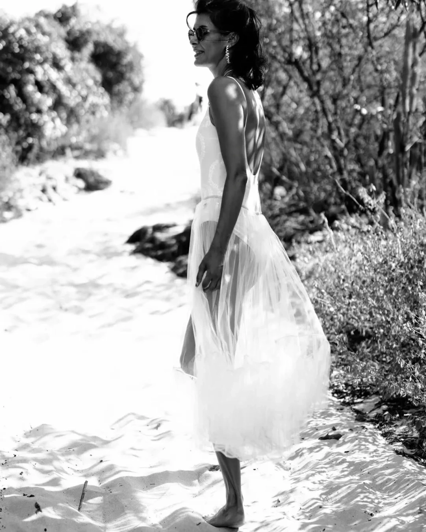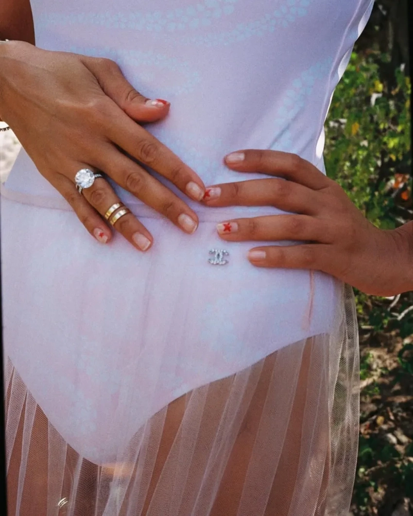 На фото Оболенцева позирует в купальнике Chanel и прозрачной юбке на острове Сен-Барт, где пара год назад сыграла свадьбу. "Любовь — это пятое время года. А.А.А.", — подписала фото Надежда.