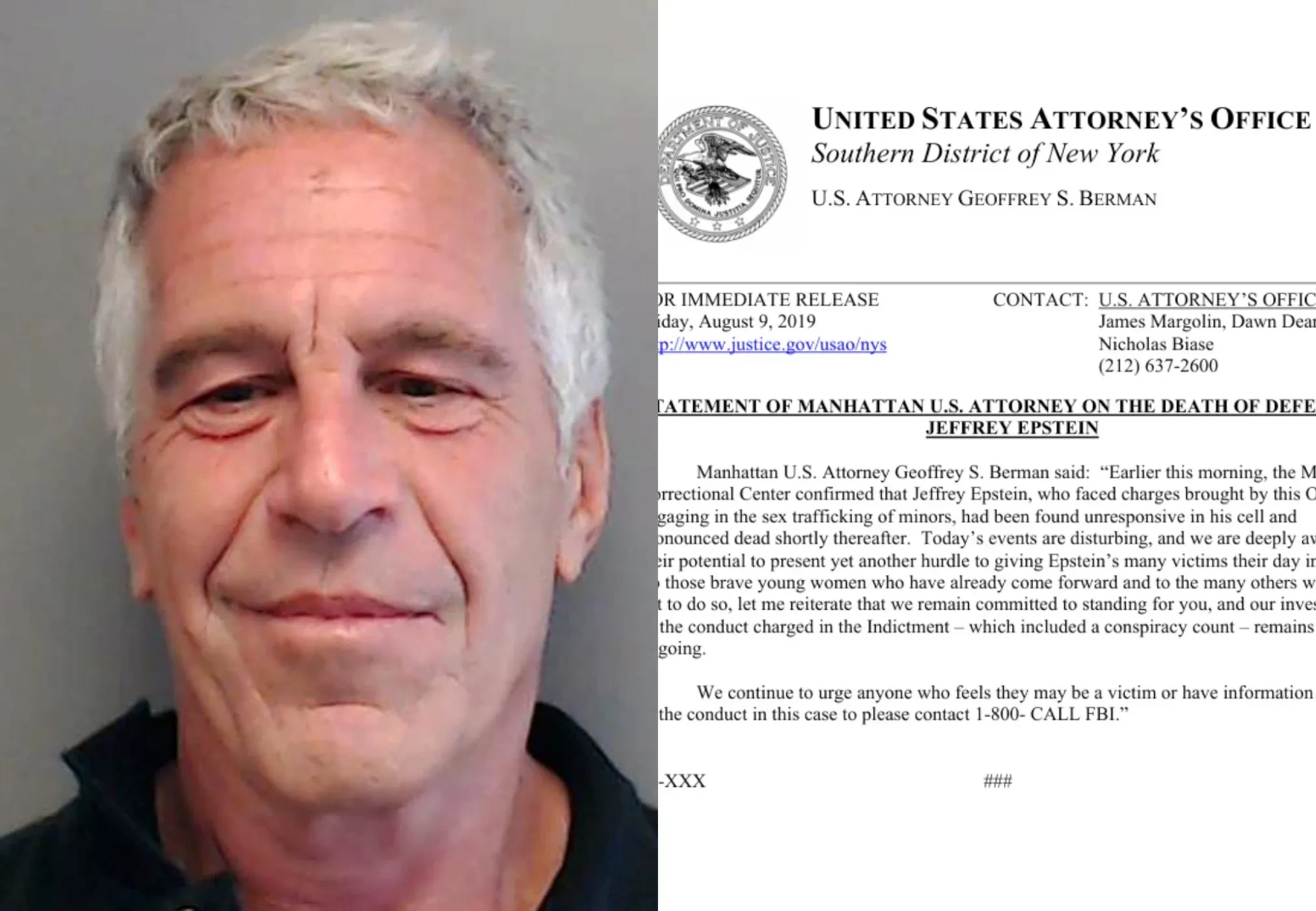 Министерство юстиции США обнародовало черновик заявления прокурора Манхэттенского округа Джеффри Бермана от 9 августа 2019 года. В нём указано, что Джеффри Эпштейн был найден без признаков жизни и вскоре после этого объявлен мёртвым. По официальным же данным, миллиардер совершил суицид в камере, где его обнаружили 10 августа около 6:30 утра во время раздачи завтрака.