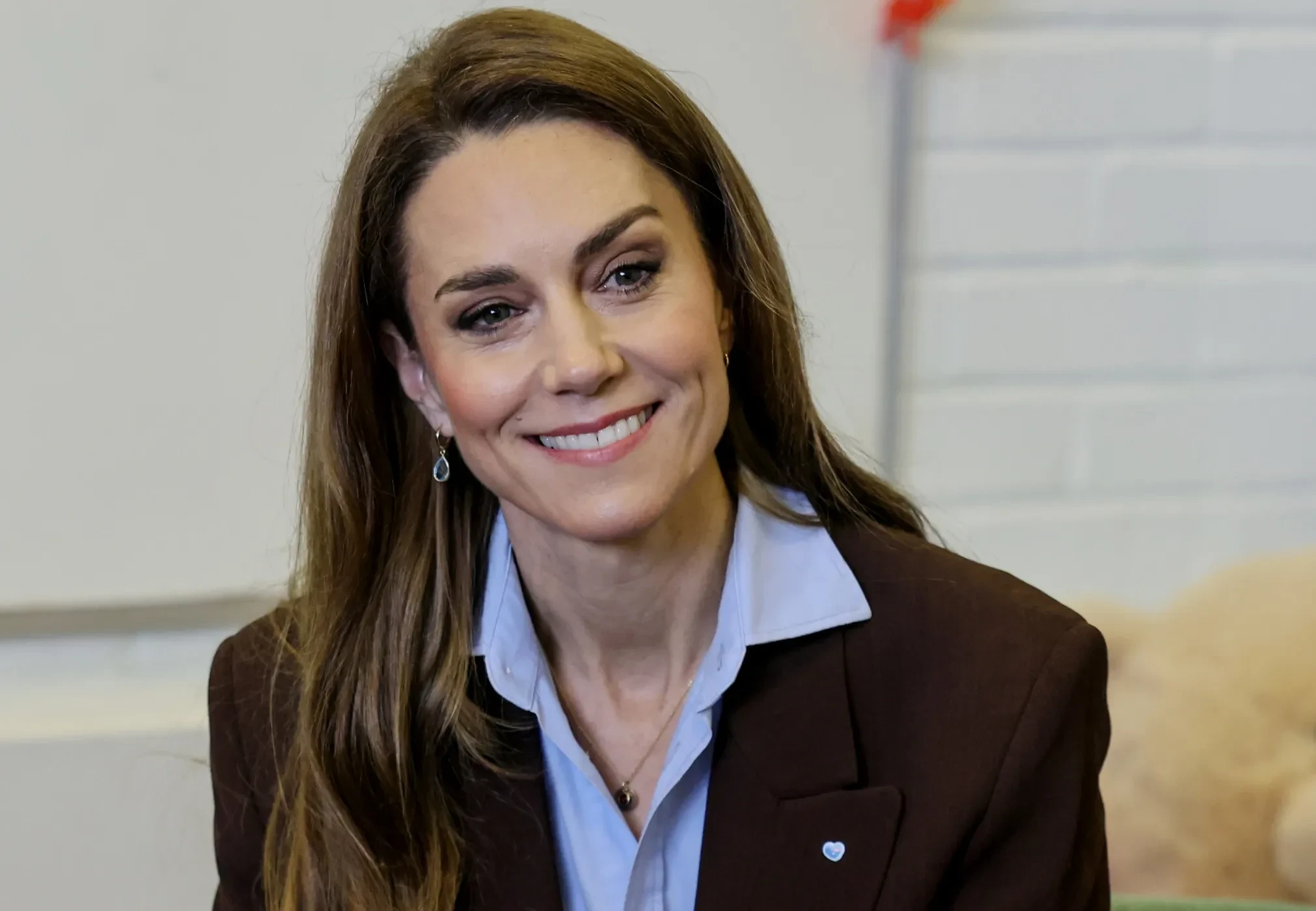 На публике Кейт появилась в коричневом брючном костюме с голубой рубашкой. Её образ дополняли лоферы в тон наряда и бриллиантовые украшения.