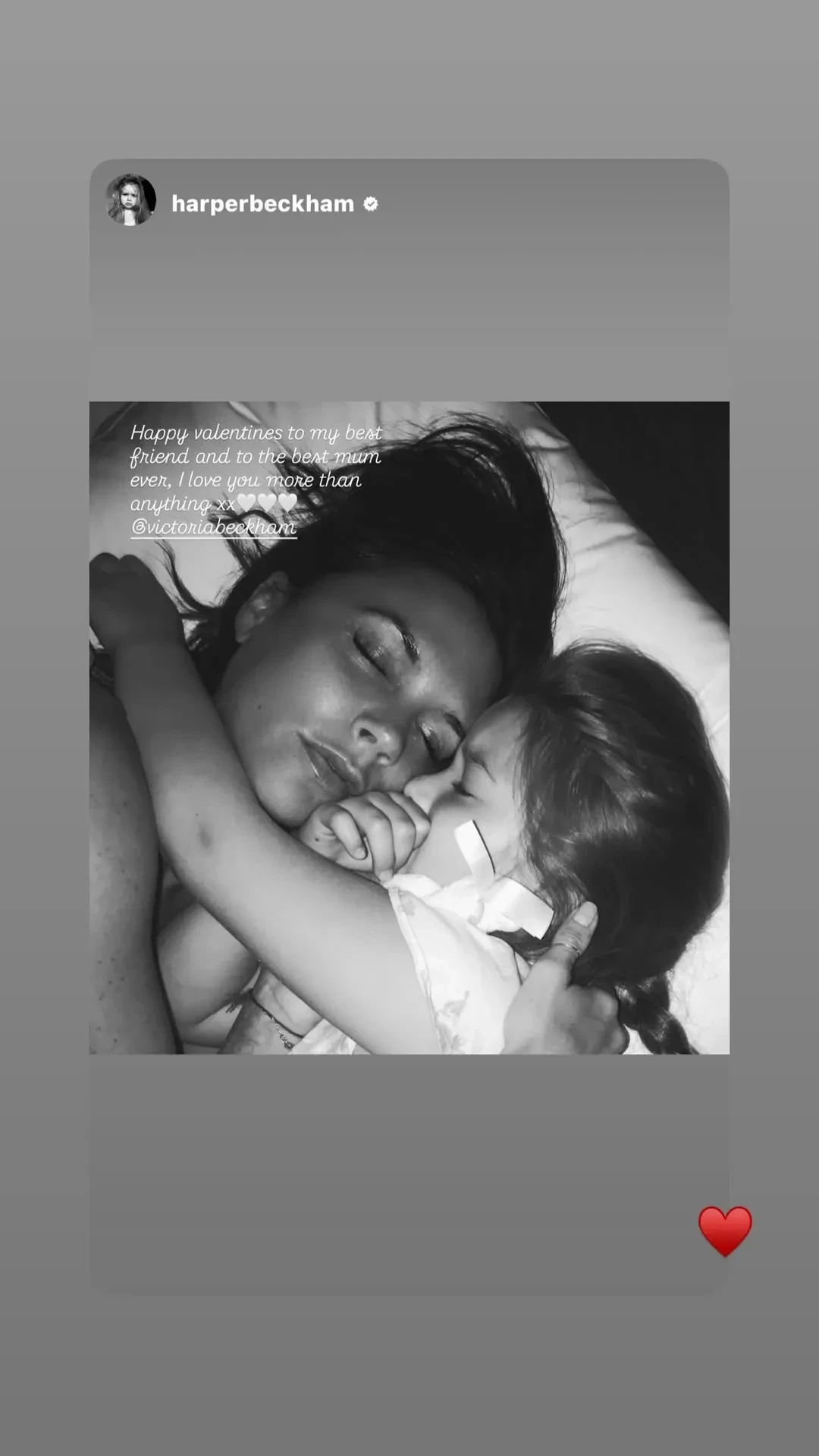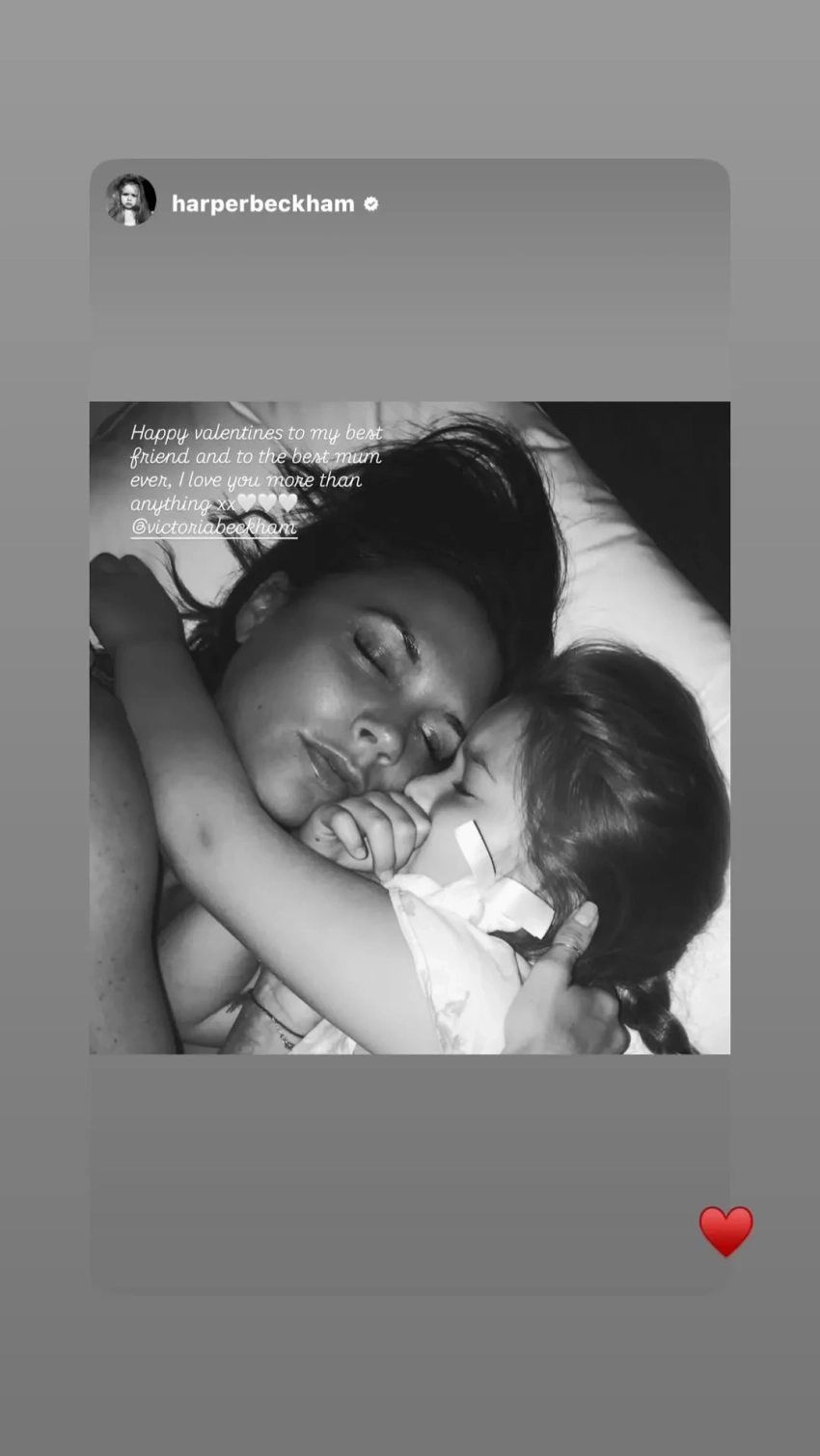 "С Днём святого Валентина моего первого и неизменного Валентина. Люблю тебя больше, чем весь шоколад и все цветы в мире", — подписала 14-летняя дочь Дэвида Бекхэма Харпер архивное фото с ним.