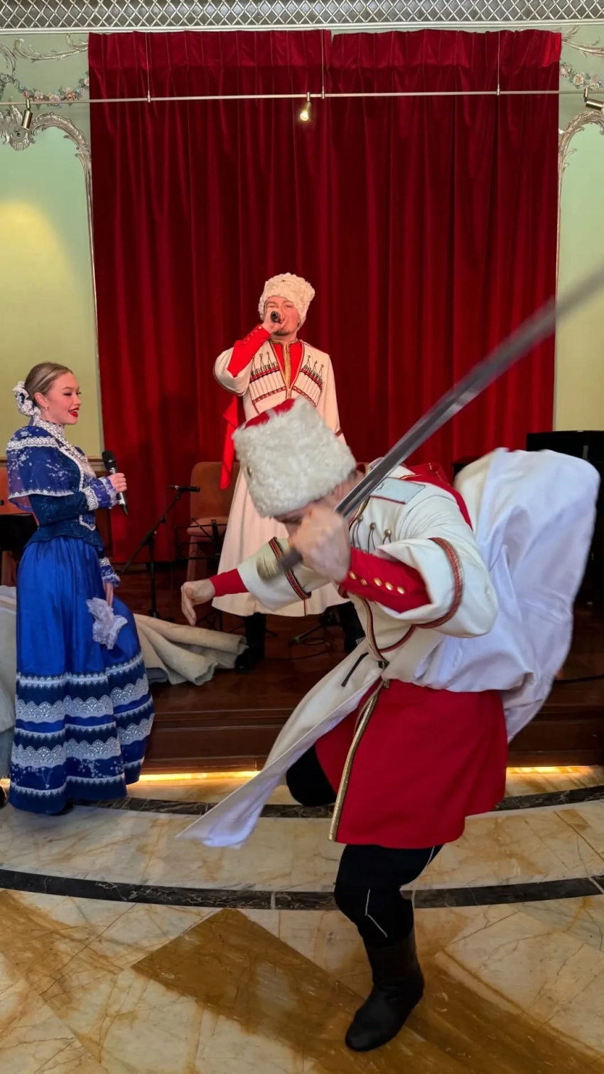 Хозяйка праздника, которая лишь недавно сделала пластическую операцию, появилась перед гостями с внучкой. Присутствующих, для которых был объявлен "жёлто-белый" дресс-код, угощали блинами, их развлекал казачий хор. Пространство было украшено живыми нарциссами.