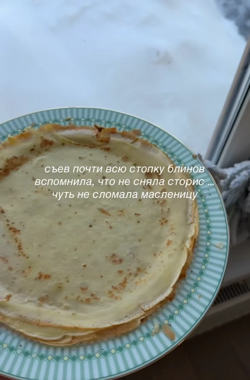 Актриса Екатерина Волкова рассказала, что встала в 6:30 утра, чтобы приготовить блины для дочери и отправиться на работу, а Полина Подплетённая назвала процесс приготовления блюда "пыточной", а первый блин у неё получился "комом". Блогер призналась, что провела на кухне полдня, устала и лучше пойдёт поработает. Ведущая Юлия Коваль настолько любит праздник, что съела "почти всю стопку блинов".