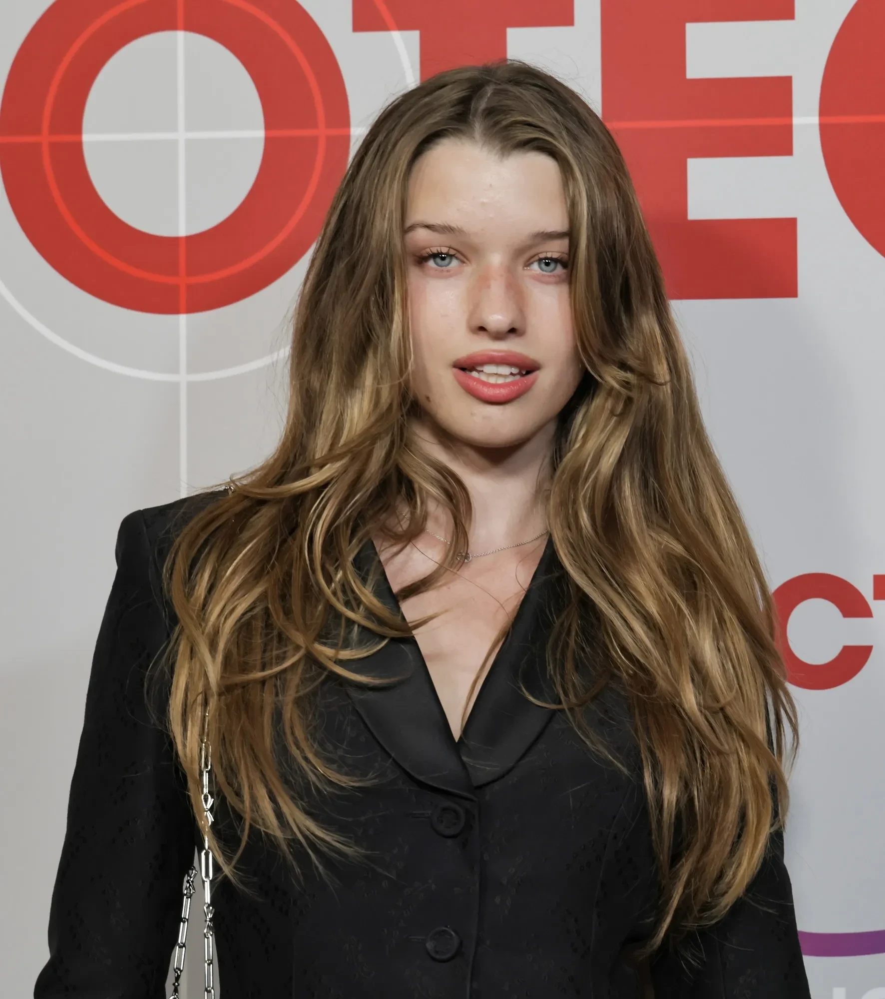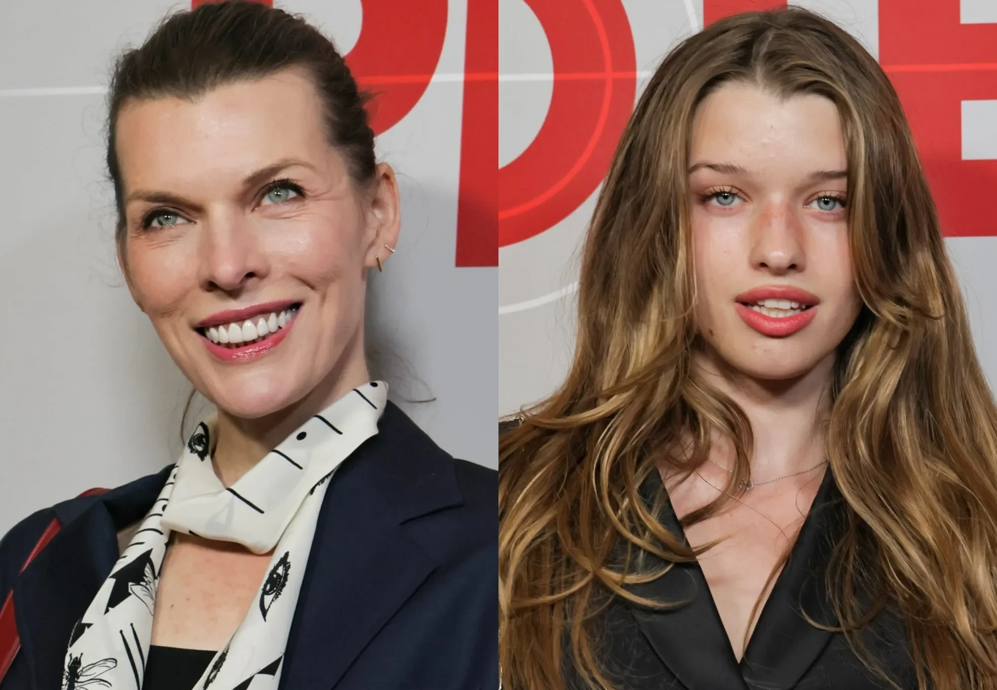 Мать и дочь позировали фотографам по отдельности. 50-летняя Милла Йовович пришла в синем укороченном тренче, который она надела как платье, и коричневых сапогах. Образ дополнили красная сумка и белый шарф с принтом. 18-летняя Эвер Андерсон выбрала более классический образ — чёрный приталенный жакет с юбкой макси и туфли в тон.
