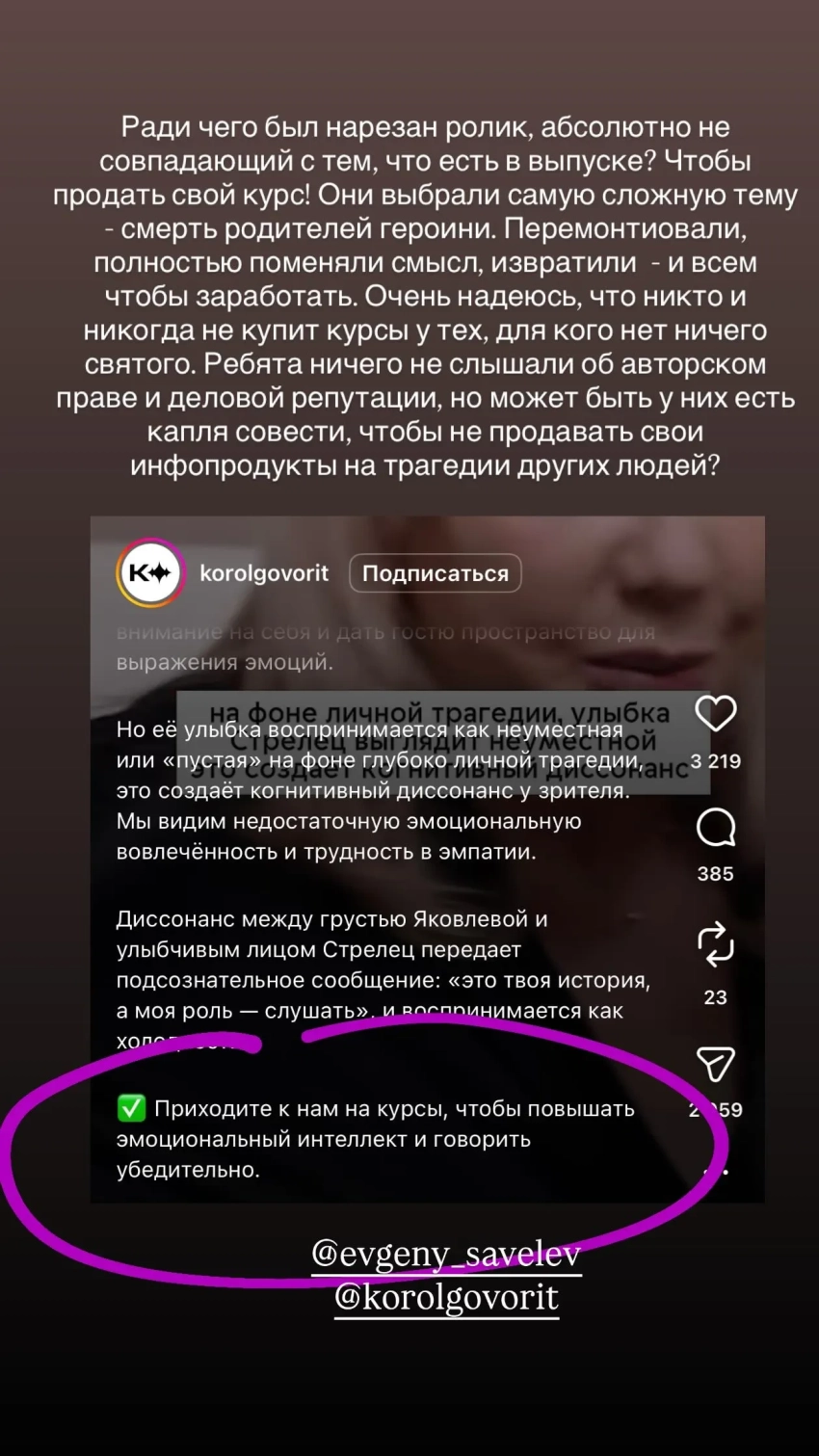 Надежда Стрелец, отрывок из видео в аккаунте школы "Король говорит""Для этих ребят нет ничего святого: взята была тема смерти родителей героини моего последнего интервью. Этот отрывок извратили и опошлили, создали хайп, устроили травлю в мою сторону, — и всё, чтобы продать свои курсы".