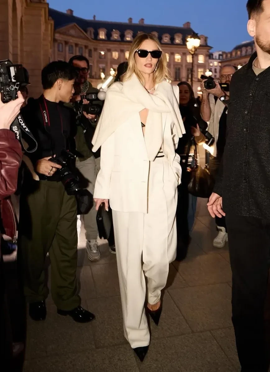 38-летняя Рози Хантингтон-Уайтли, которая ранее посетила шоу Saint Laurent, пришла на показ Tom Ford в белом брючном костюме. Модель дополнила образ солнцезащитными очками на фоне недавней критики её "нового лица".